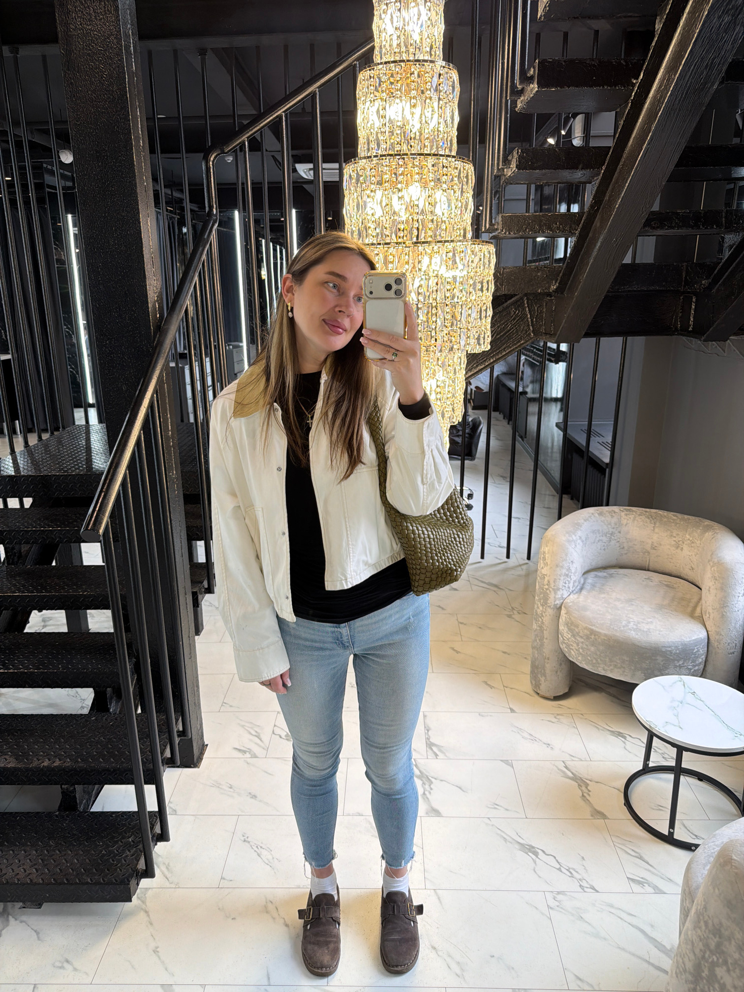 A young woman is captured in a mirror selfie, standing in a modern indoor space in Moscow, Russia. She is positioned slightly to the left of the frame, smiling with her tongue playfully extended, and…read more