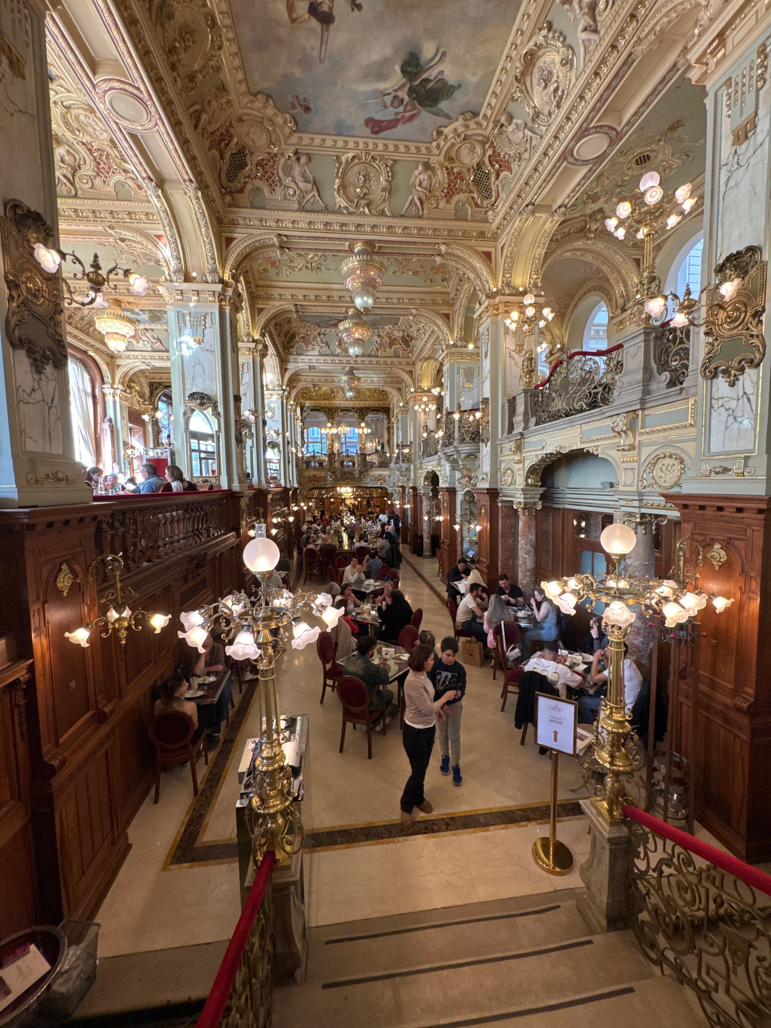 The media file captures a lavish, ornate interior space, presented in a portrait orientation but originally captured sideways. The setting is a grand cafe or restaurant, likely a historic landmark, co…read more