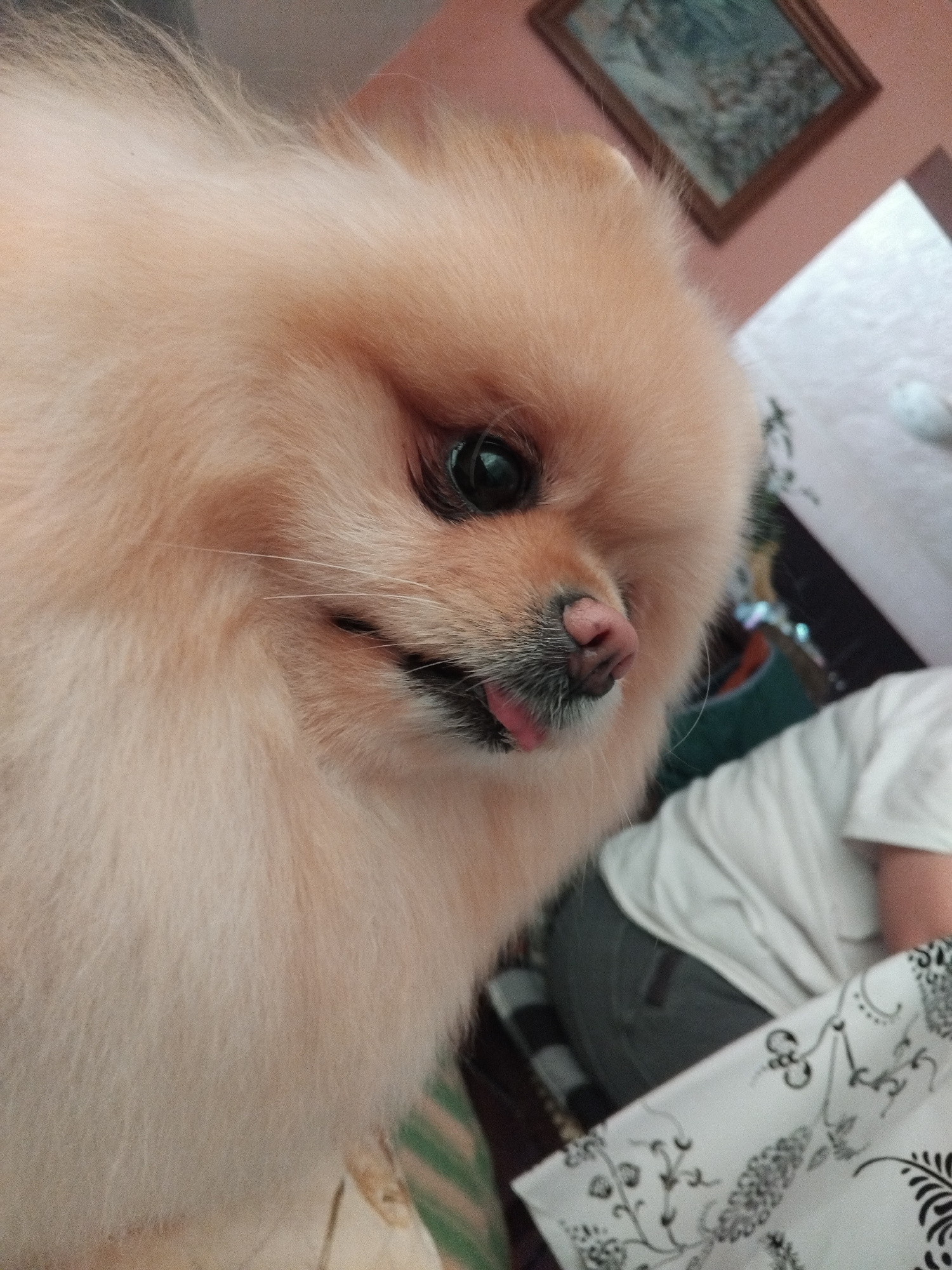A close-up shot features a light-orange Pomeranian dog with a pink nose and a small pink tongue sticking out of its mouth. The dog's fur is long and fluffy. The background shows a person wearing a whi…read more
