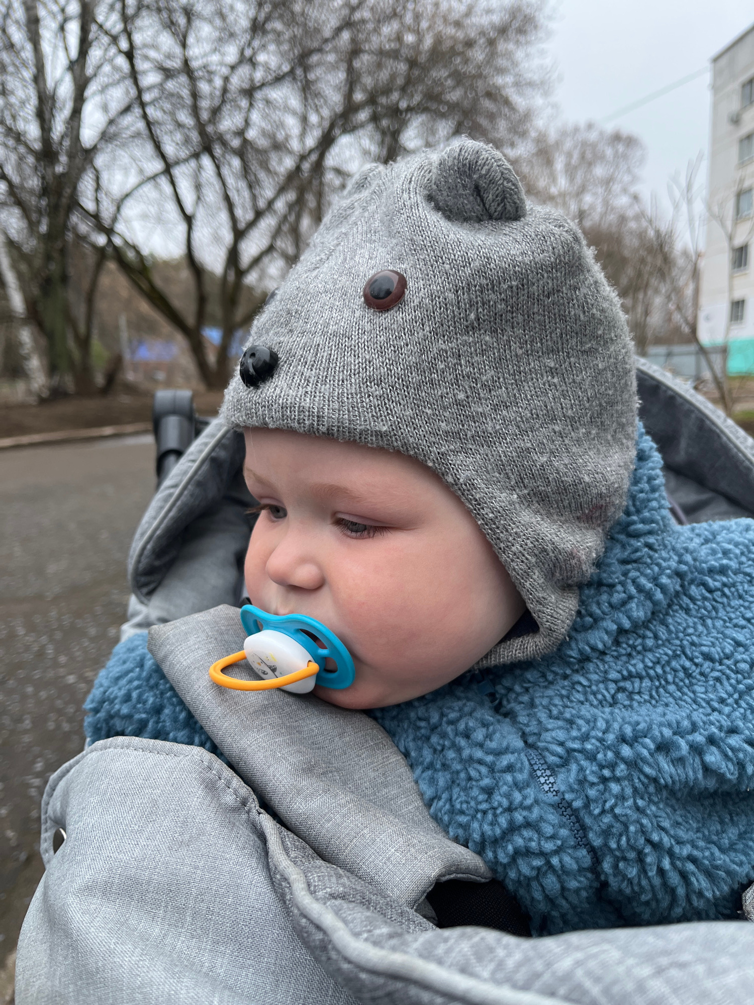 An outdoor, slightly tilted, close-up shot captures a baby nestled in a light gray stroller, likely in Chaikovsky, Russia. The baby is dressed warmly, wearing a gray knitted hat styled with bear ears…read more