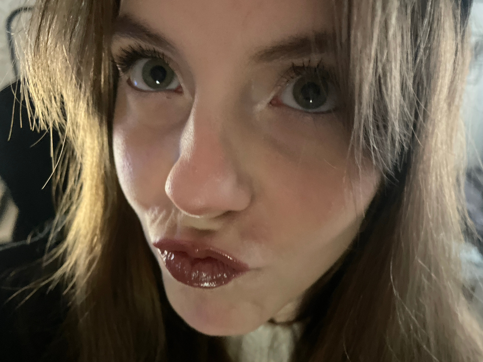 The image is a close-up, inverted selfie of a woman. Her face is centered, with her eyes looking directly at the camera. She has fair skin, light brown hair, and dark-colored eyes. Her lips are coated…read more