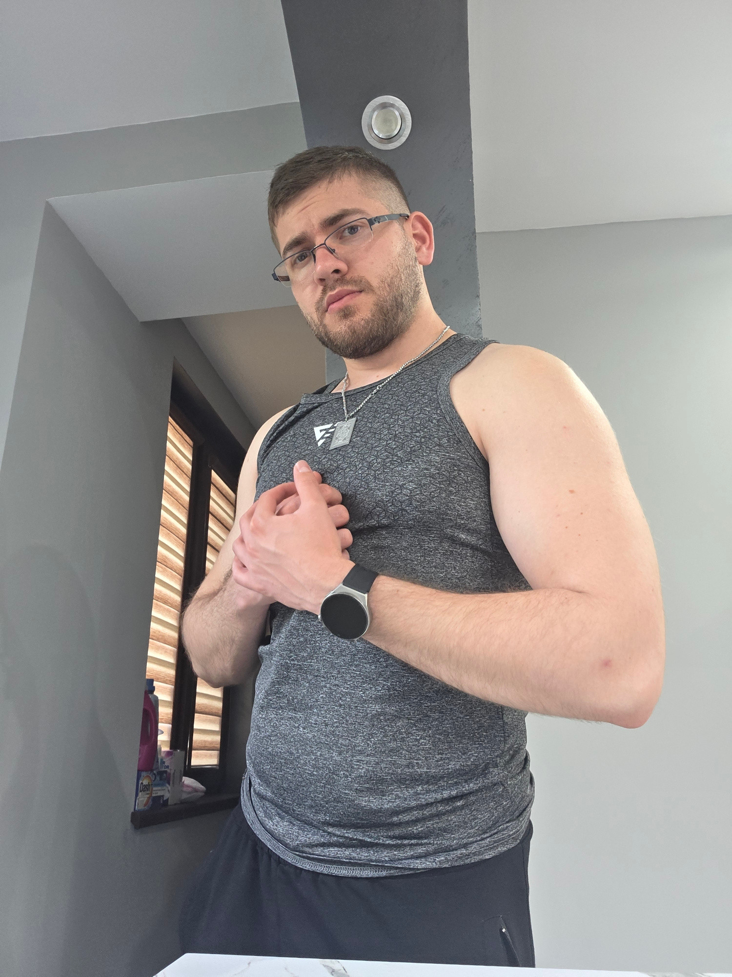 A man with a beard and glasses is photographed indoors from a low angle, appearing to stand. He is wearing a gray tank top, black shorts, and a smartwatch. He has a silver necklace. The background inc…read more