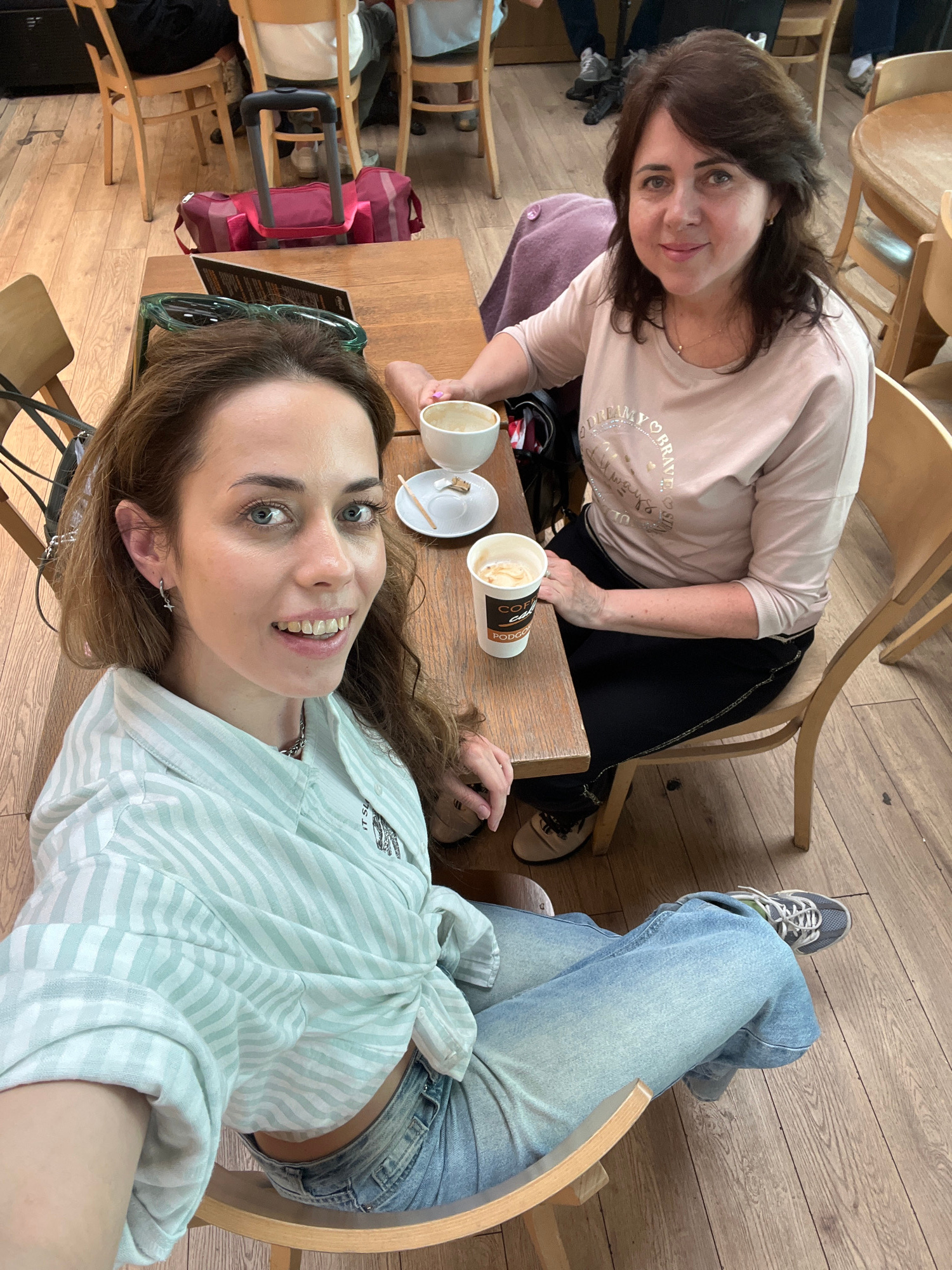 Two women are seated at a wooden table in what appears to be a cafe or restaurant in Golubovci, Montenegro. The image is oriented horizontally, with the women looking towards the camera and smiling, s…read more