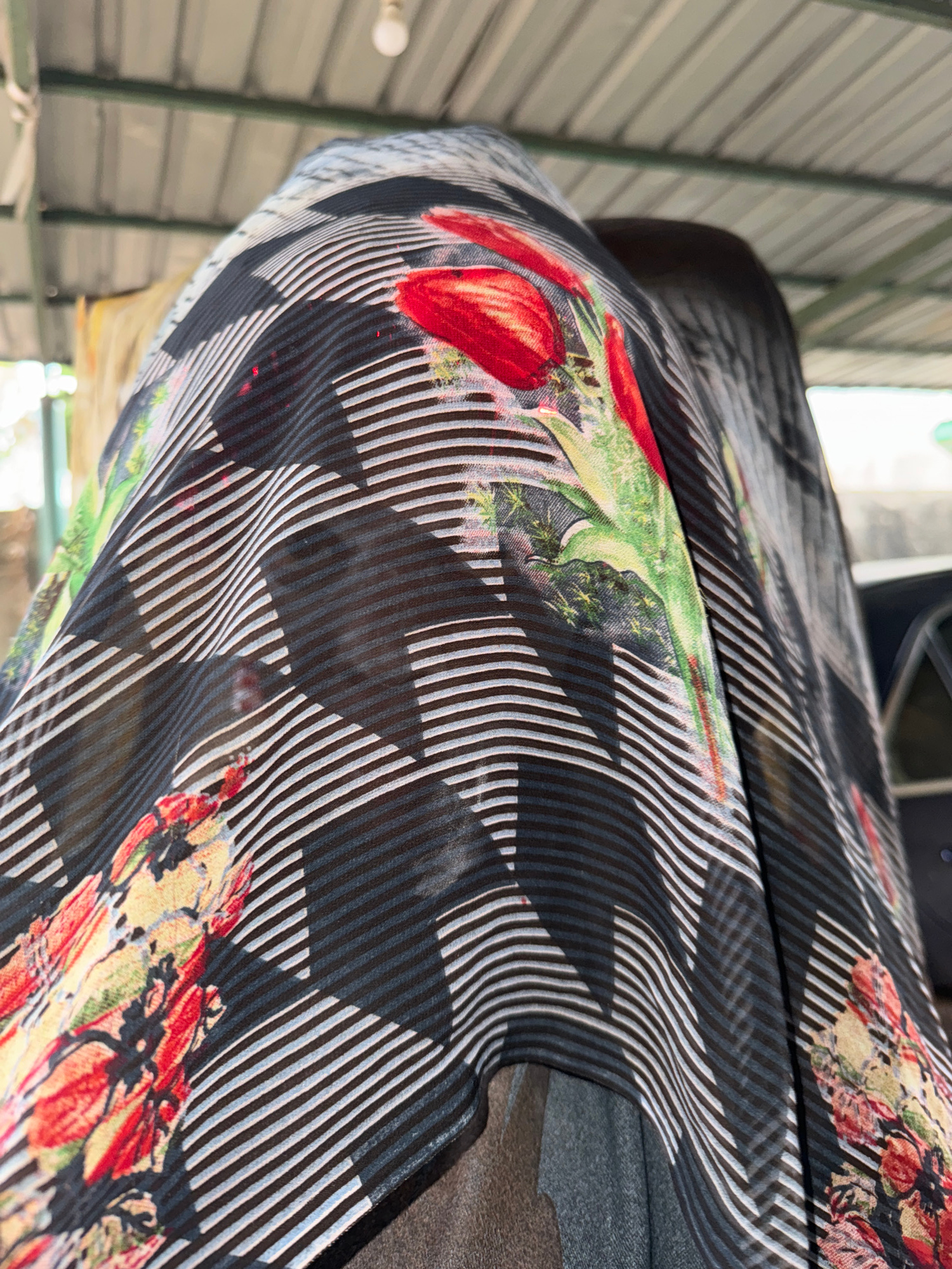 The image shows a patterned fabric with a print of red peppers and flowers on a black and white striped background. It is draped over a surface or object. The location appears to be indoors, with a co…read more
