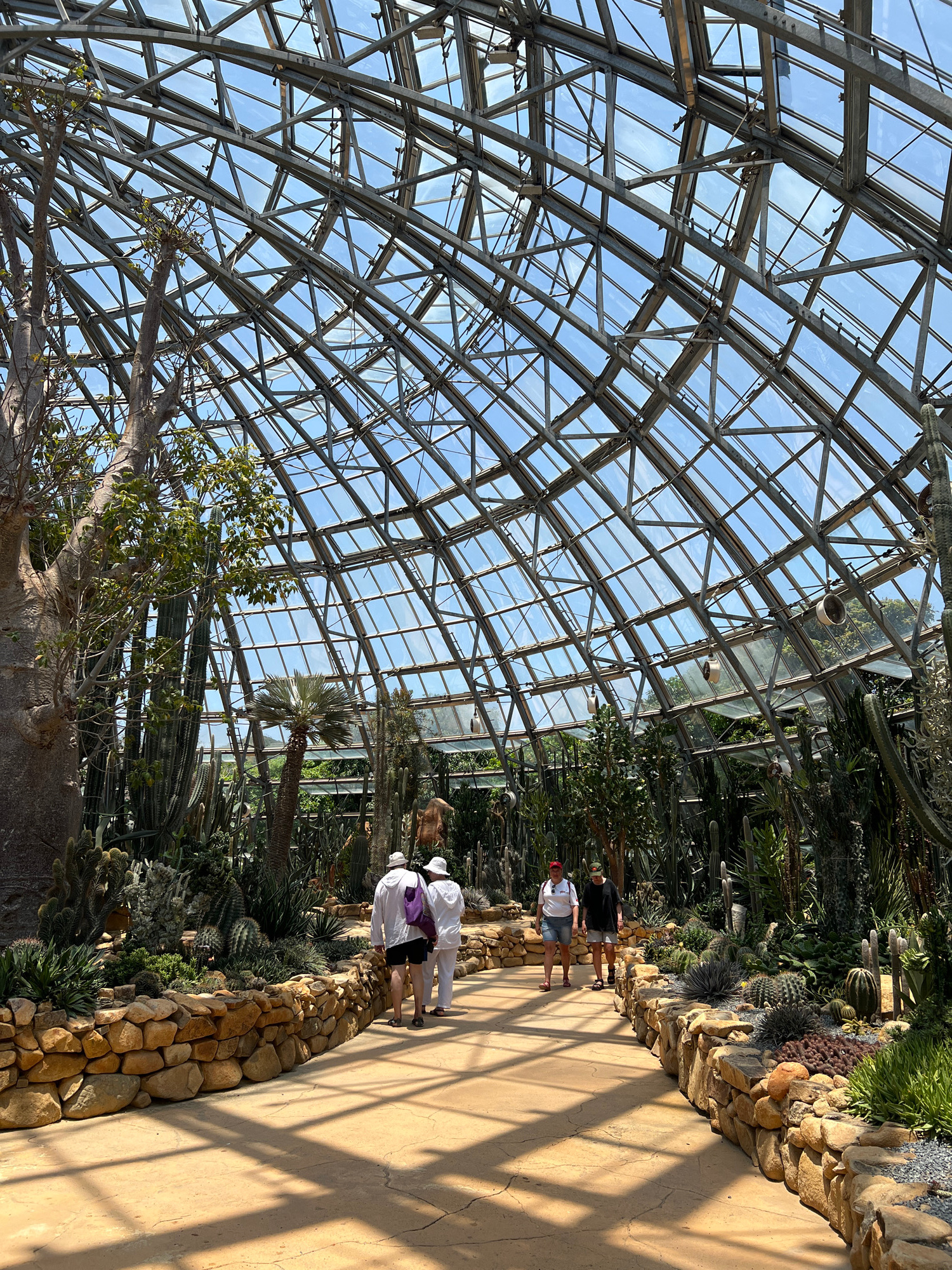 The image captures a scene inside a glass-domed structure, likely a botanical garden or greenhouse, in Nha Trang, Vietnam. The complex steel framework supports a grid of glass panels allowing ample na…read more