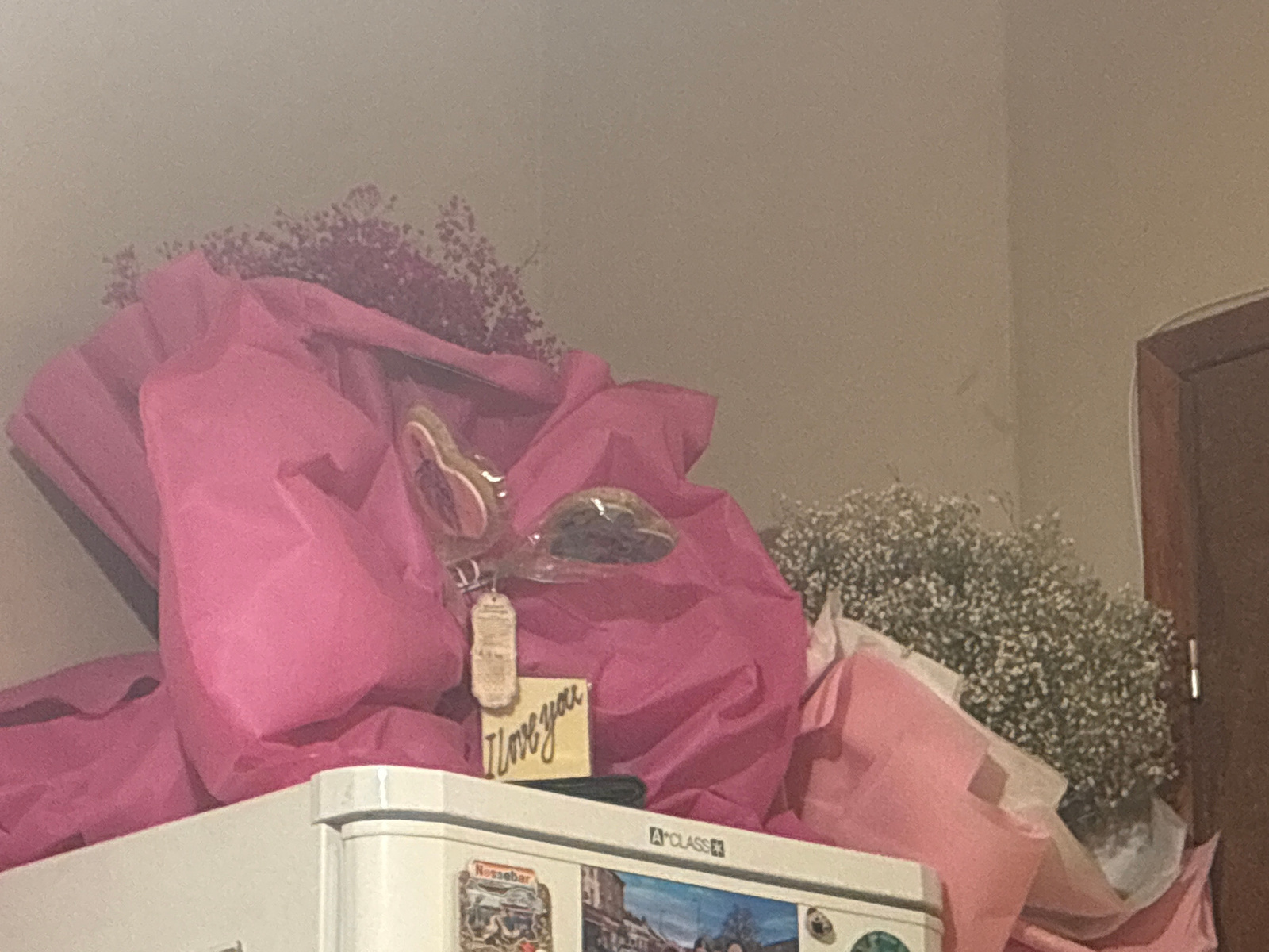 The image shows a gift arrangement. A bouquet of baby's breath flowers, wrapped in pink tissue paper, sits beneath what appears to be a small, white refrigerator. A small, handwritten "I love you" not…read more