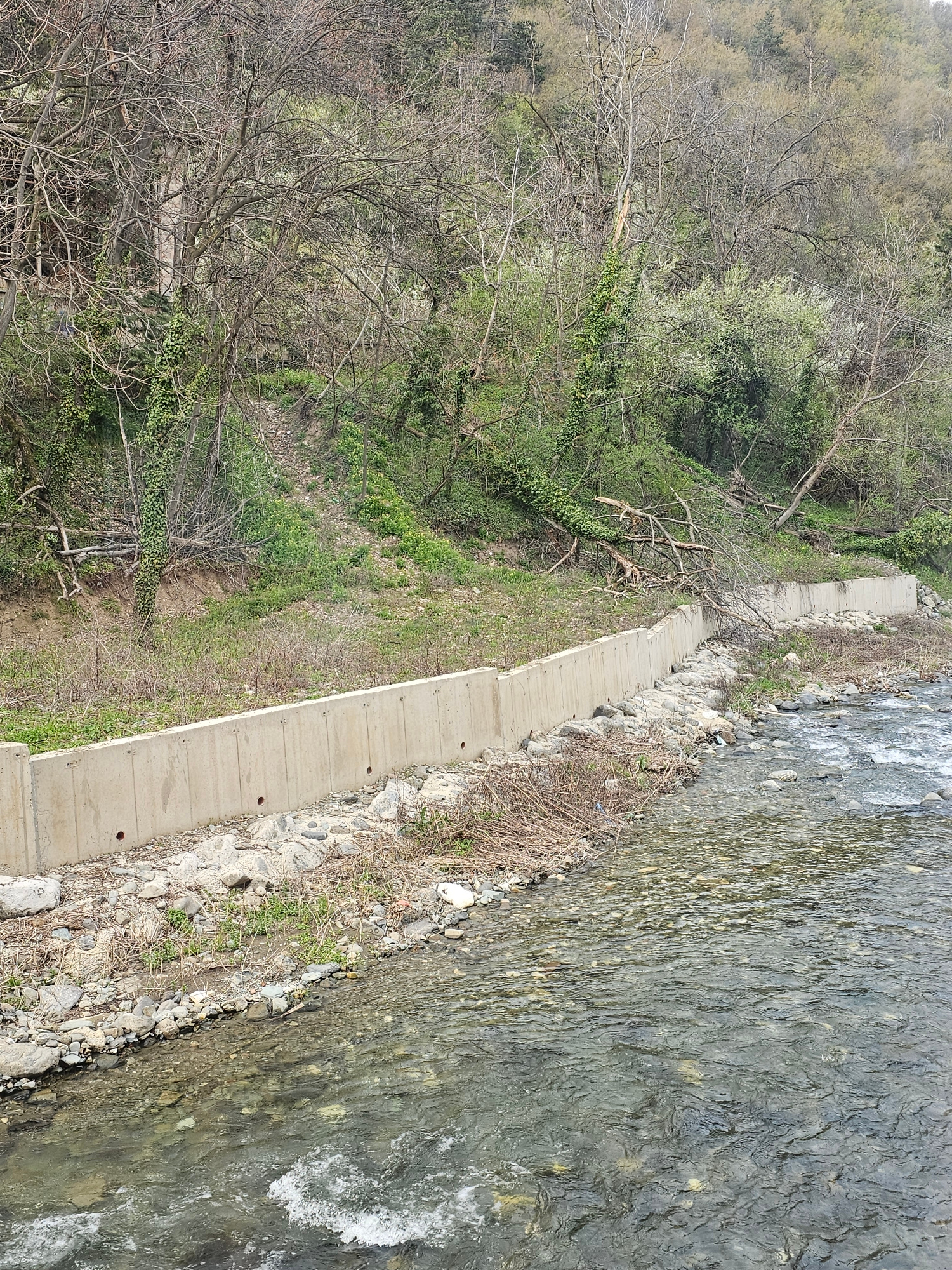An aerial view depicts a river scene, possibly in the vicinity of Berkovitsa, Bulgaria. A concrete drainage channel or pathway runs alongside a riverbank, the river is filled with rocks, while green t…read more