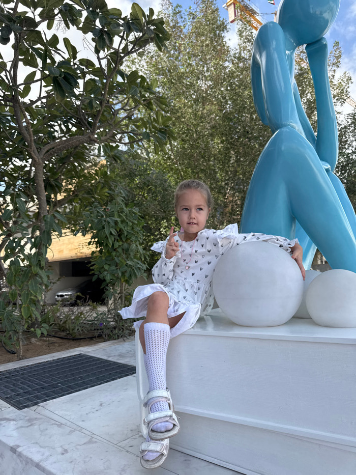 An outdoor scene captures a young female child sitting on a white rectangular base structure beside a large blue sculpture. The child, approximately 4-6 years old, has light brown hair and wears a whi…read more