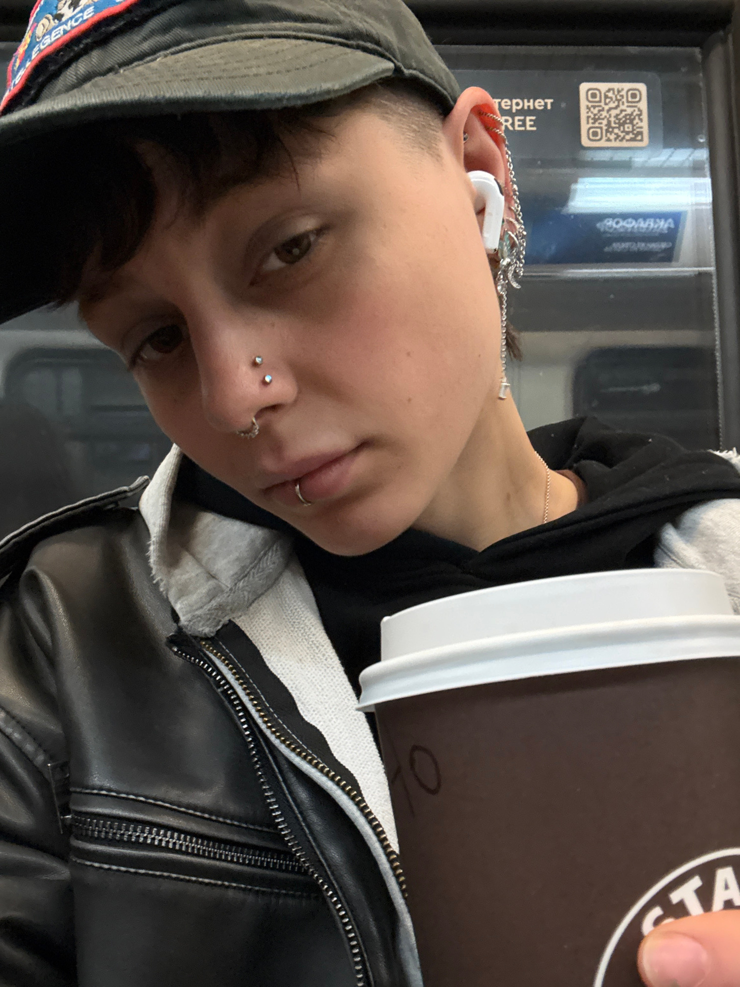 A person is holding a coffee cup while riding public transportation. The person is wearing a baseball cap, a black leather jacket, and a gray hooded sweatshirt. The person has multiple piercings on th…read more