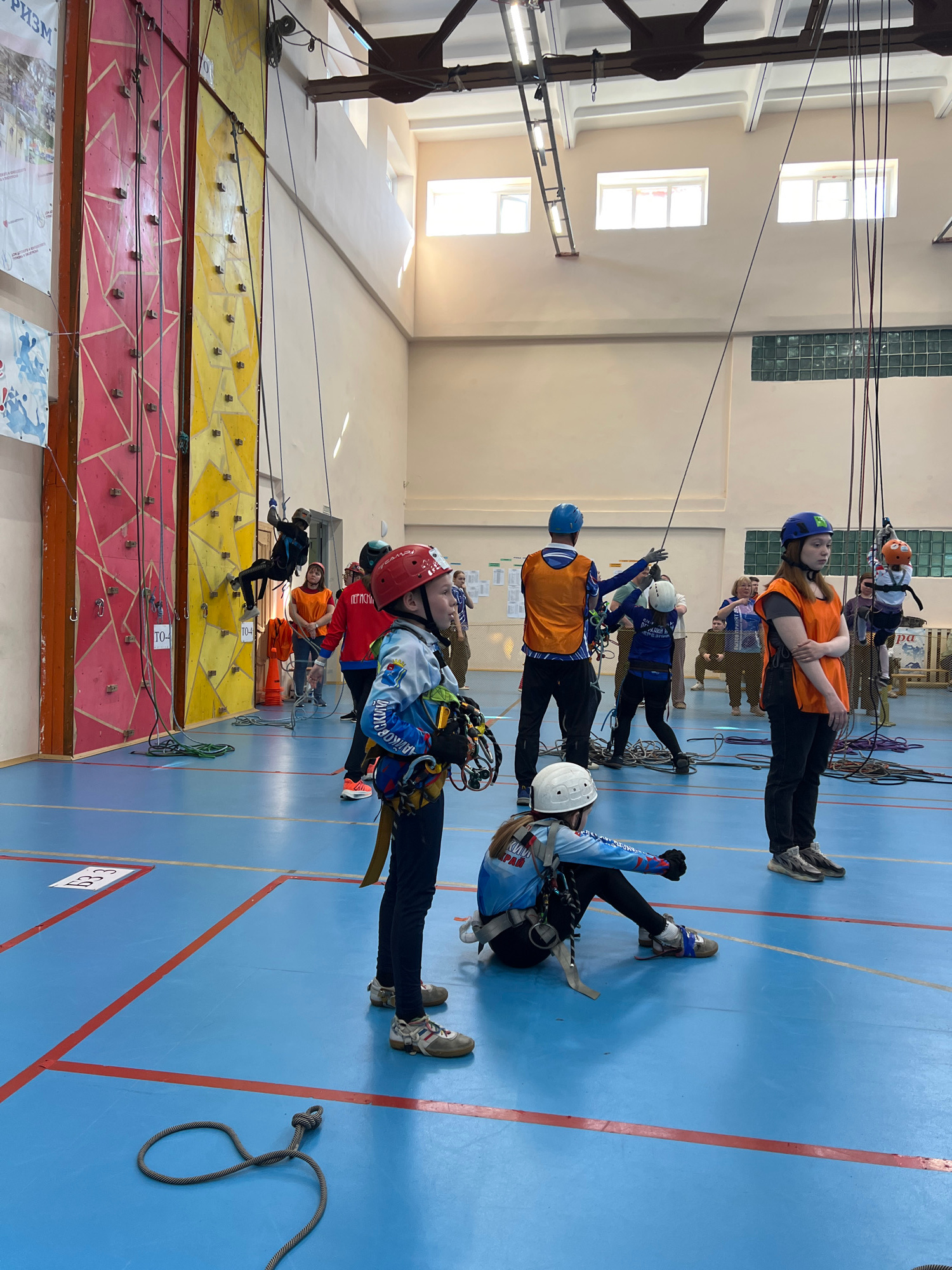 Several people are participating in an indoor rock climbing activity at a climbing wall in Berezniki, Russia. The climbing wall is divided into sections of different colors including red and yellow. P…read more