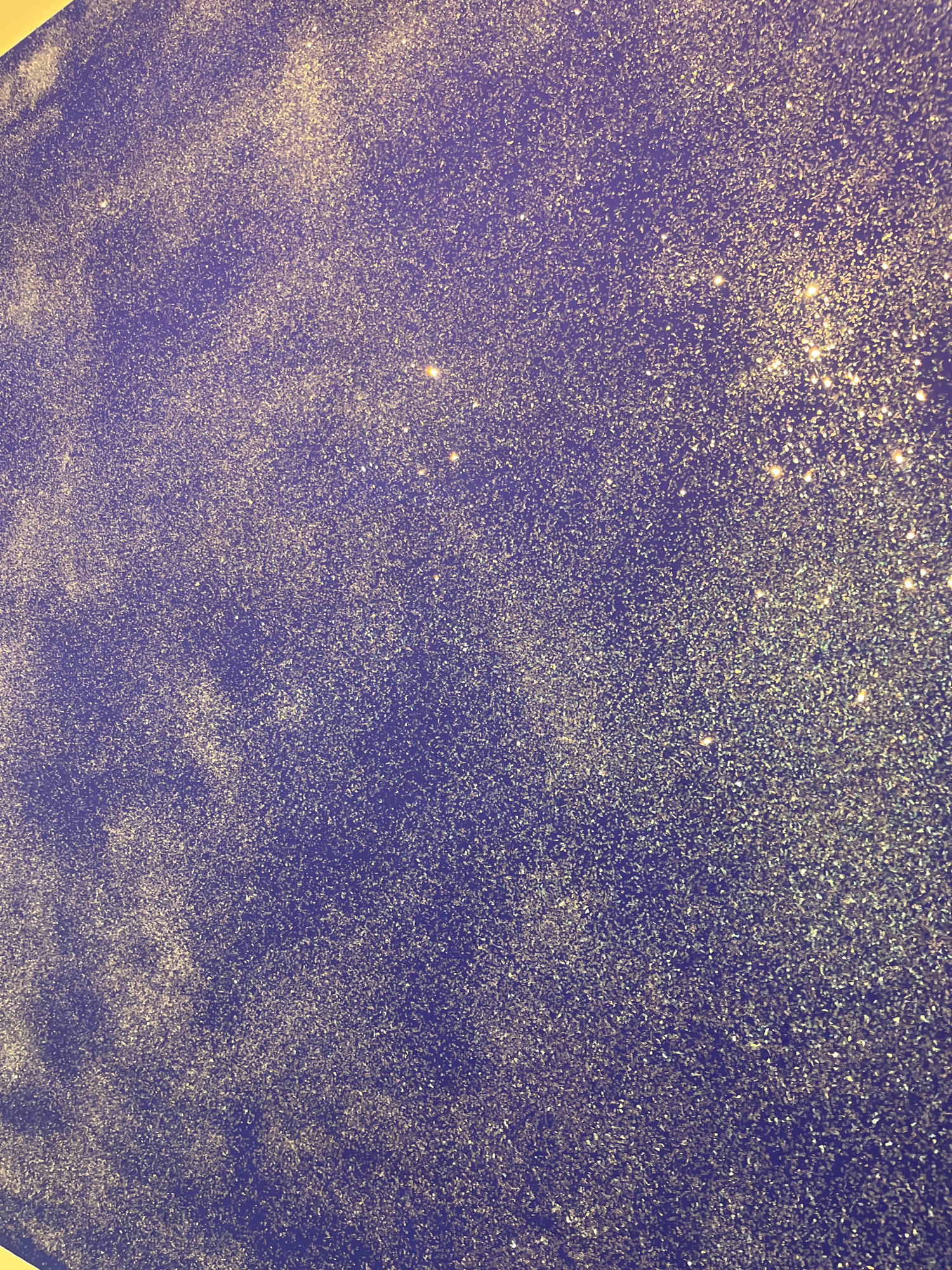 The image presents a textured surface in shades of blue and gold, resembling a night sky speckled with stars or a canvas with scattered glitter. The density of the golden specks varies, with heavier c…read more
