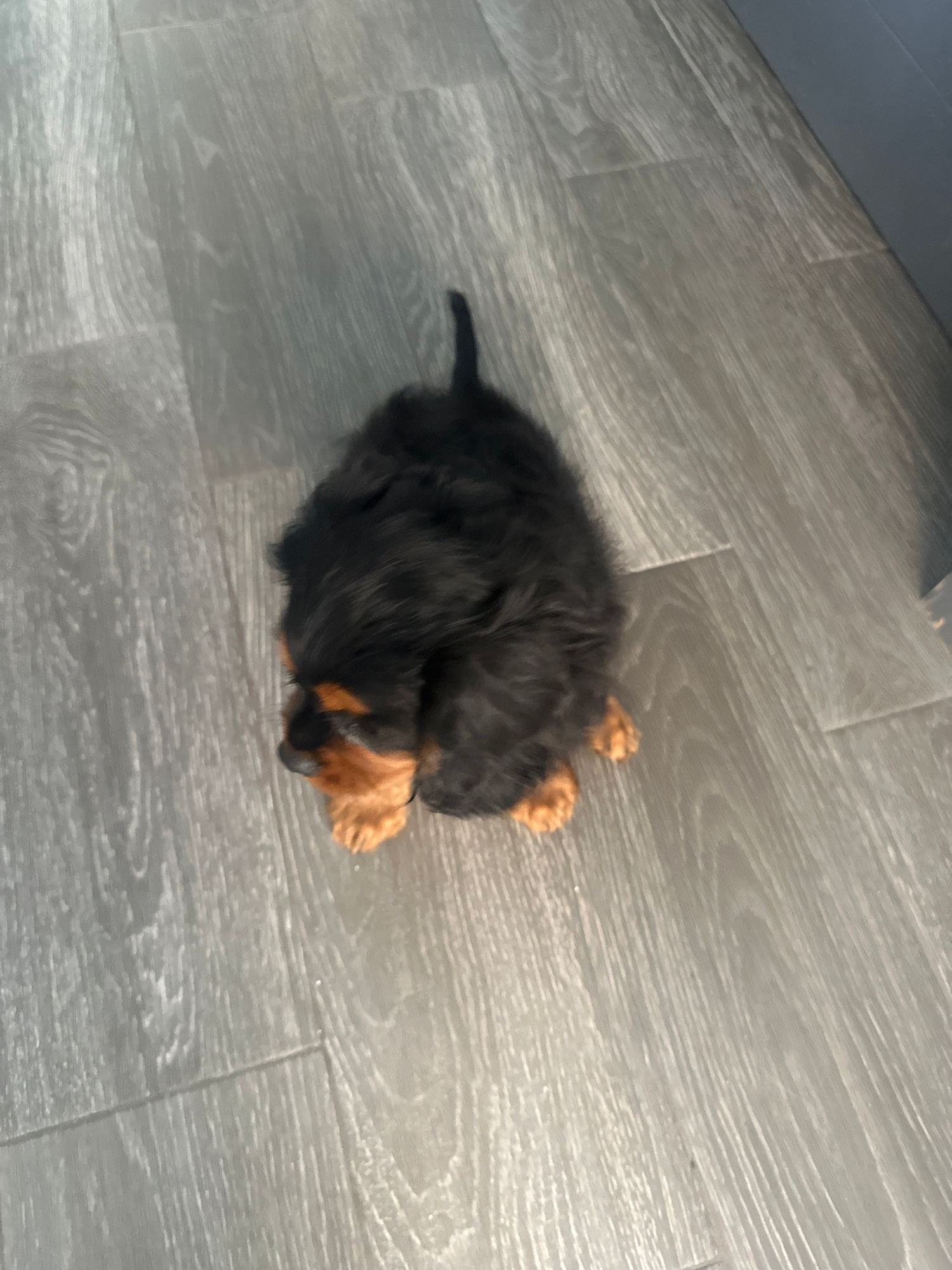 A small, black and brown puppy lies curled up on a gray, wood-patterned floor. The tail is visible to the left. The location is indeterminate.