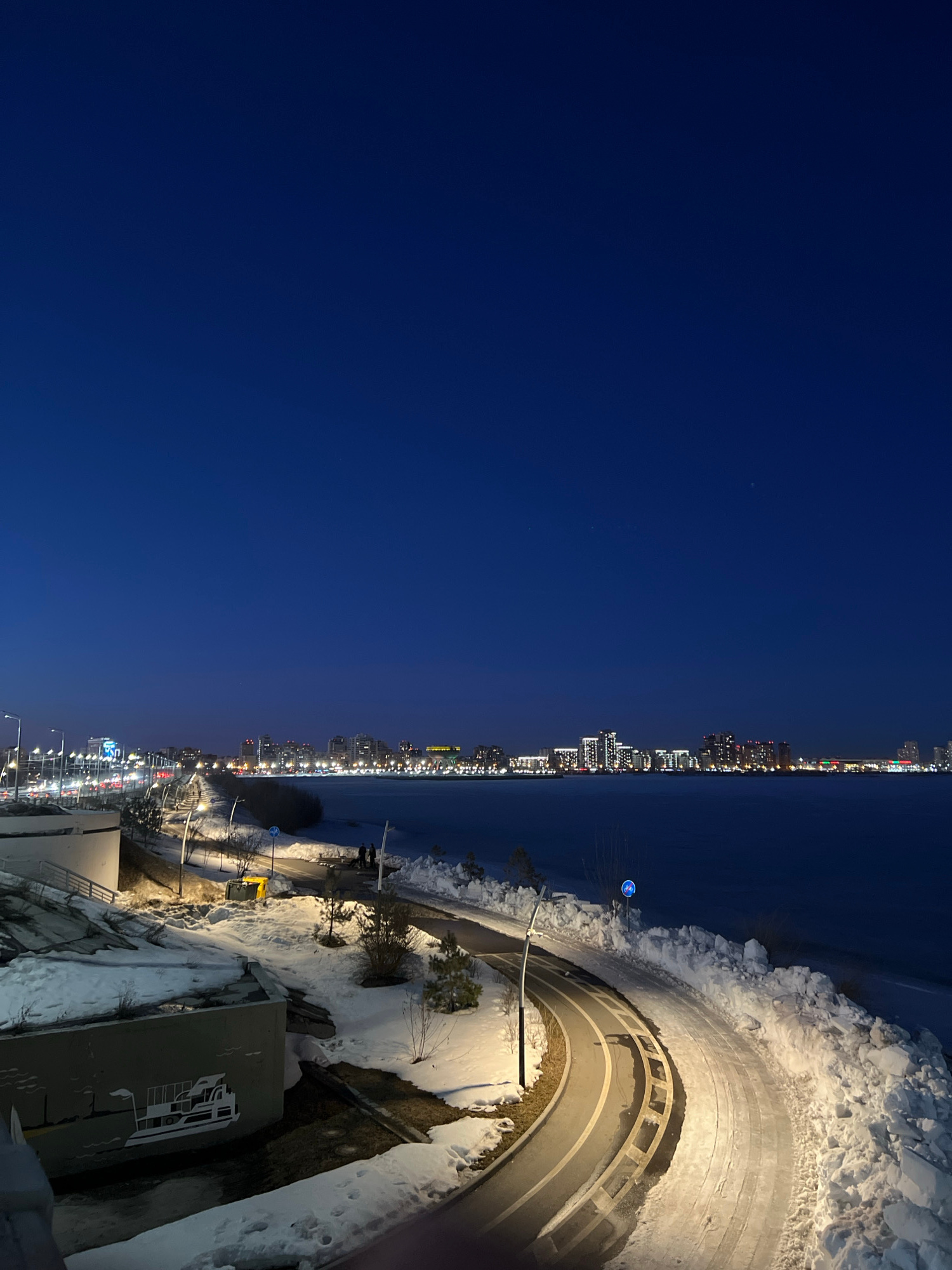 This nighttime image depicts a snow-covered urban embankment and a frozen body of water in Kazan, Russia, under a deep blue sky. In the immediate foreground, a concrete retaining wall features a whiteβ¦read more