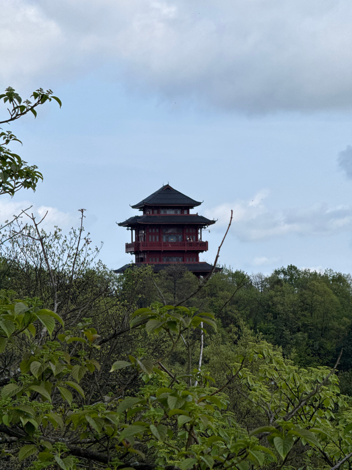 The image shows a traditional Chinese pagoda structure situated on a hillside in the city of Wulingyuan, China. The building has a multi-tiered roof with dark tiles and red supports. It is surrounded…read more
