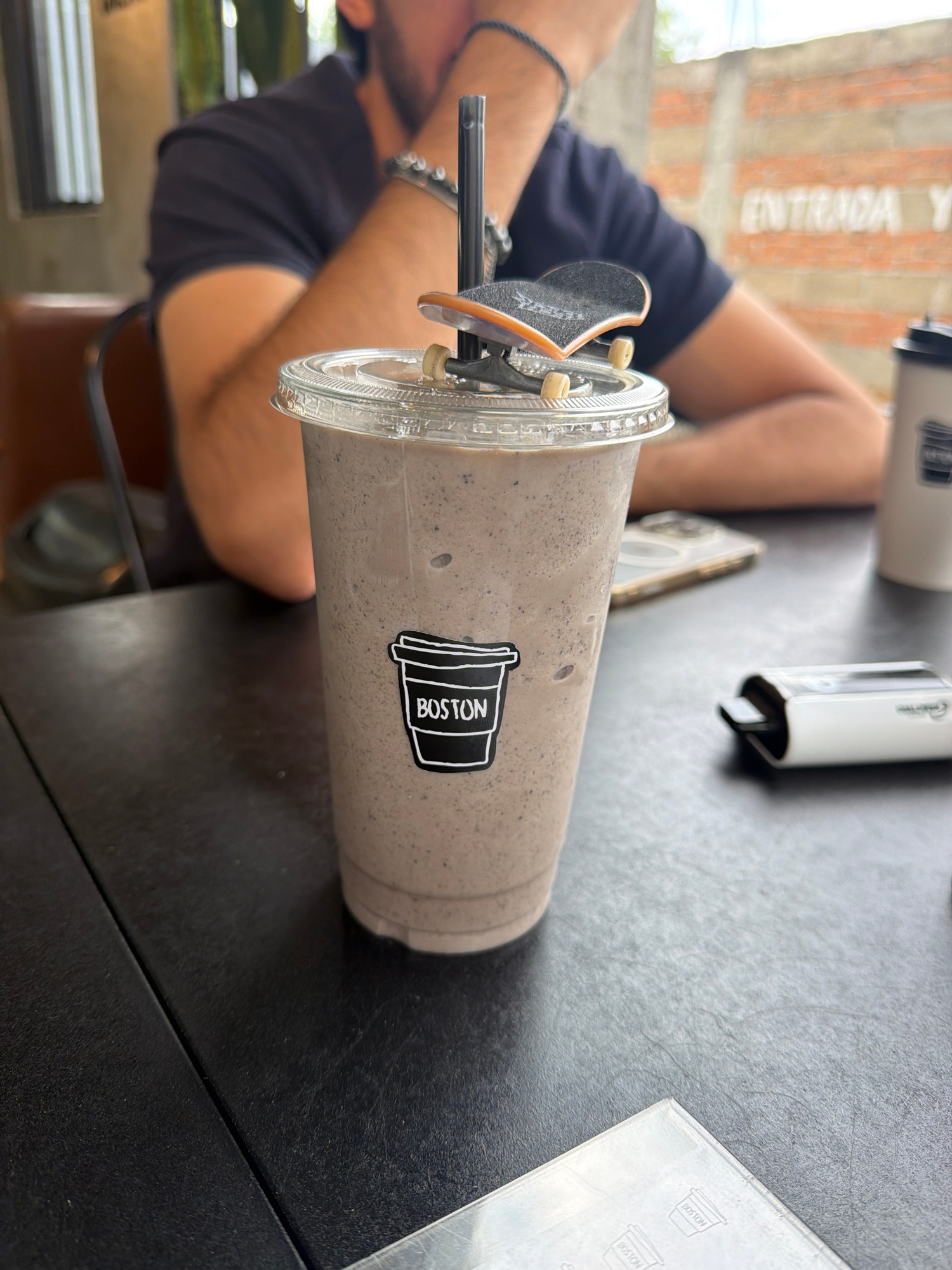 The image presents a casual scene at a cafe or restaurant in San Andrés Cholula, Mexico, during the daytime. The central subject is a tall, clear plastic cup holding a light gray, speckled beverage, l…read more