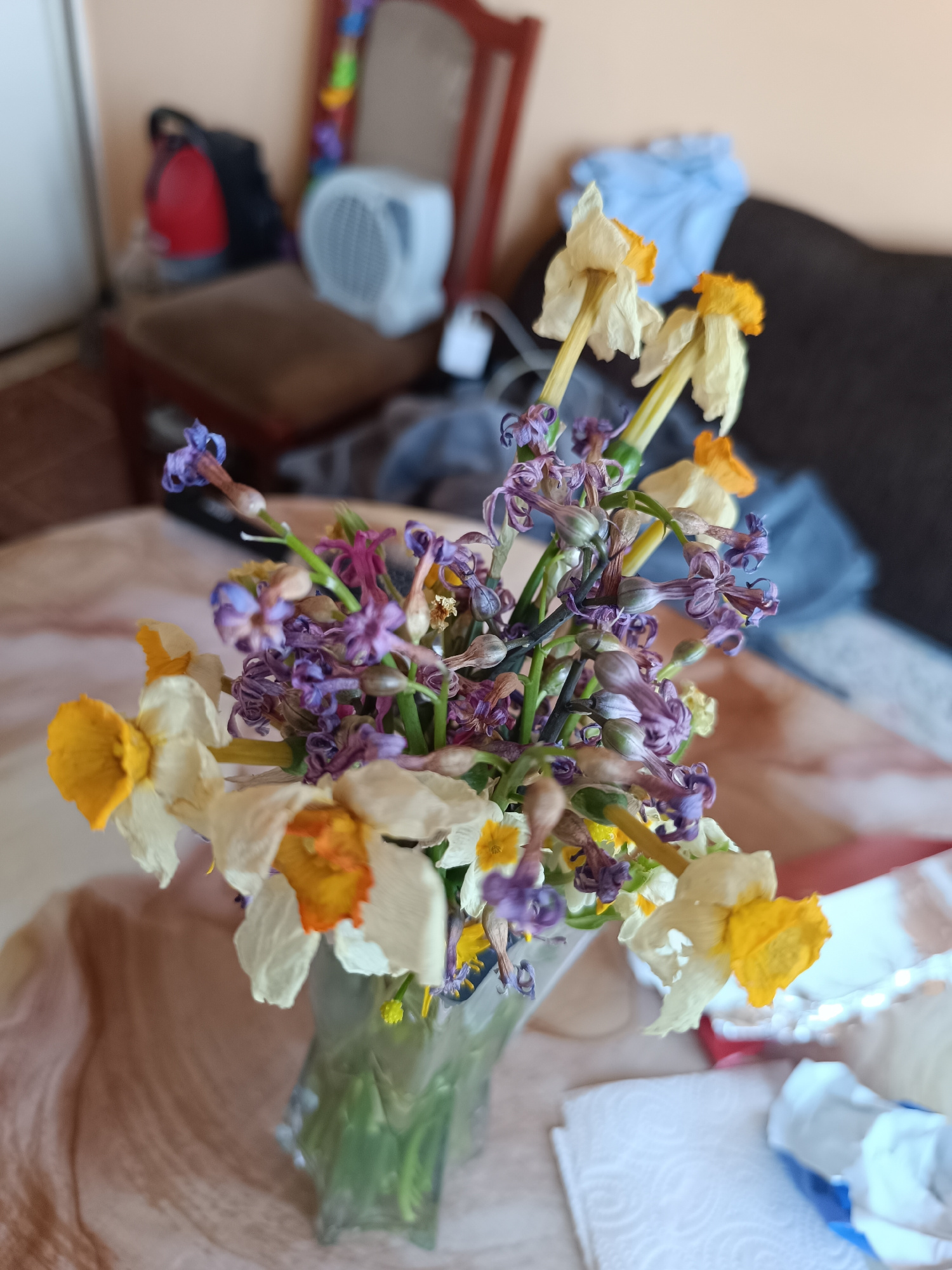 A vase of wilting daffodils and hyacinths sits on a table. The daffodils are mostly white with yellow or orange centers. The hyacinths are mostly wilted and purple. The background contains furniture iā¦read more