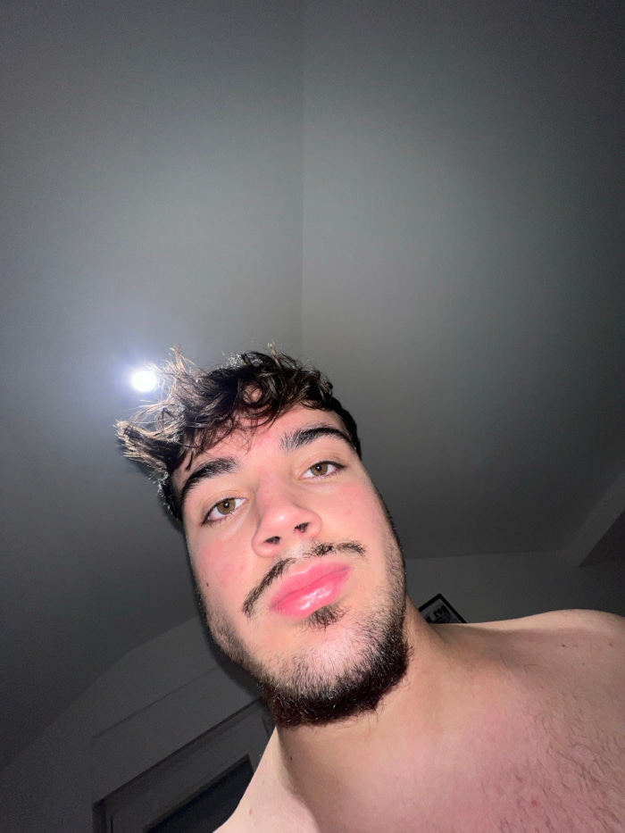 A man's face dominates the frame, captured from a low angle, his gaze directed towards the viewer. He has brown hair and a beard. The lighting highlights his face, creating a contrast between the dark…read more