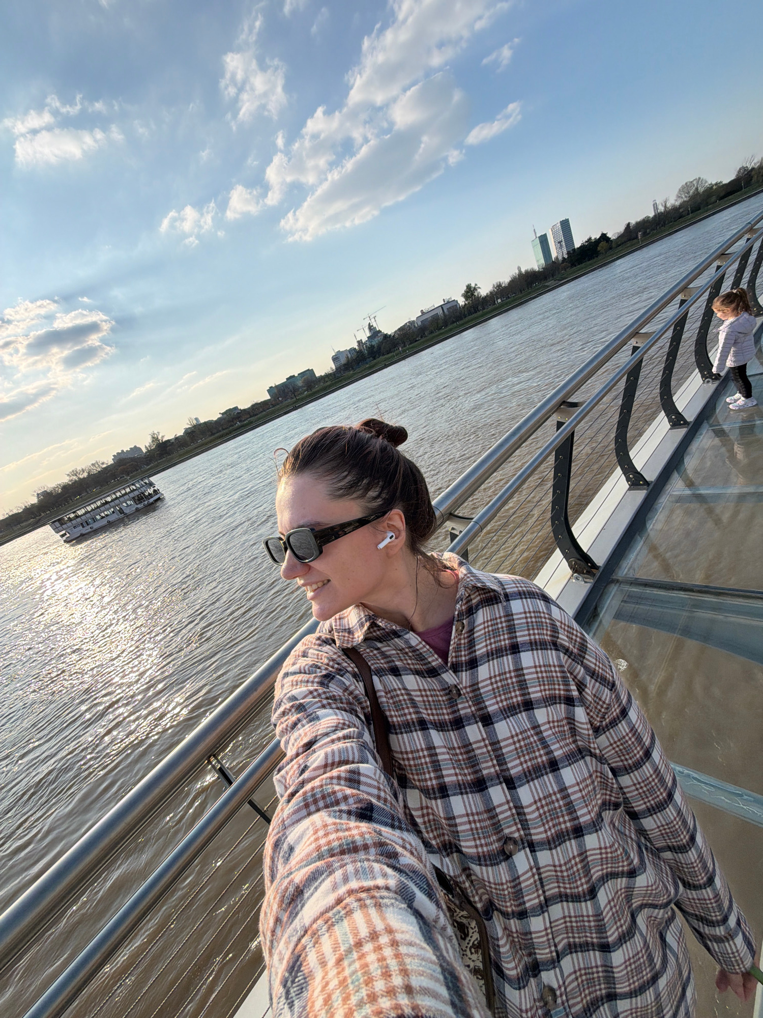 The image shows a woman taking a selfie on the glass floor of a pedestrian bridge over the Sava River in Belgrade, Serbia. A second person is visible in the background on the other side of the bridge.…read more