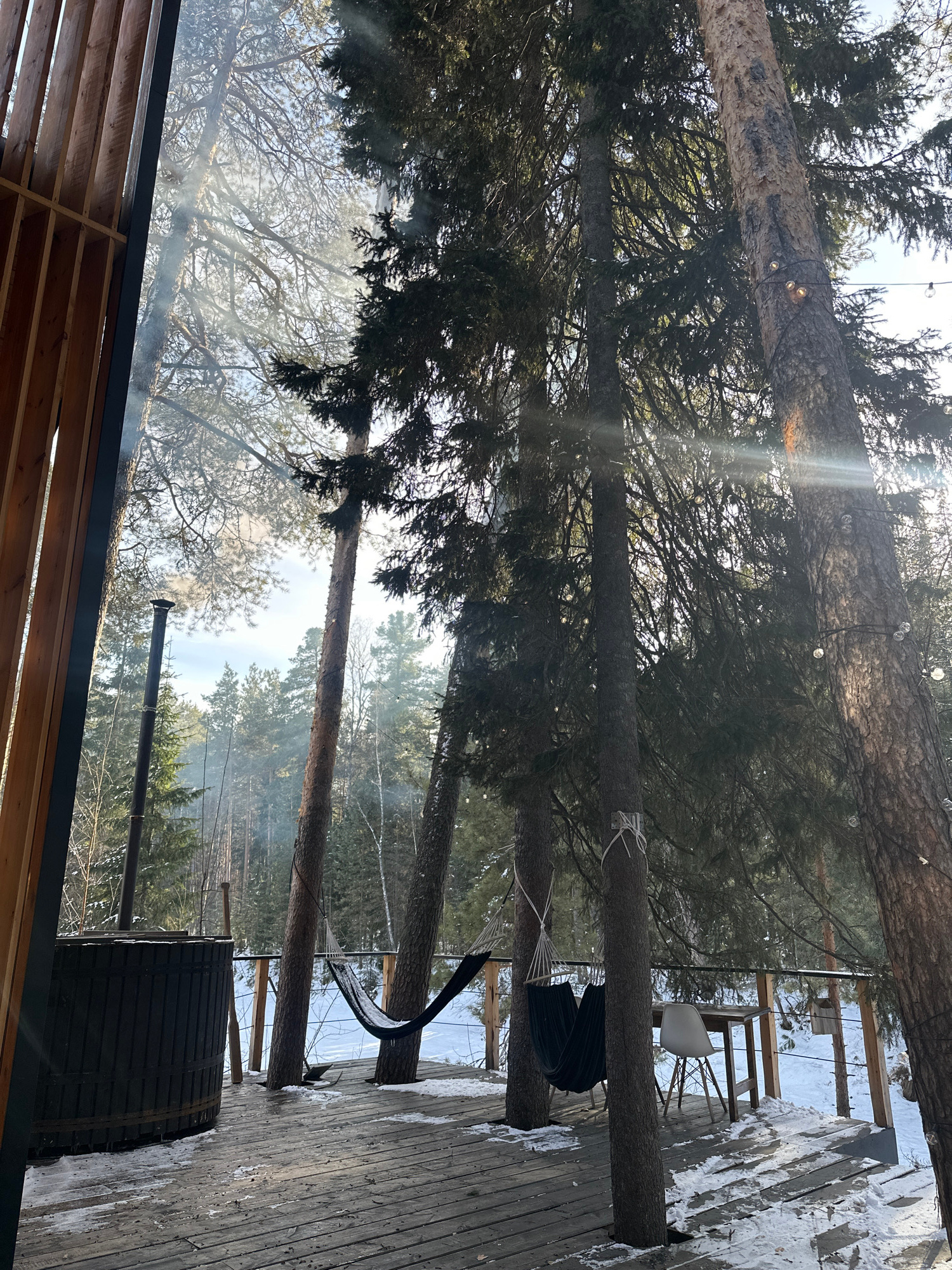 The image depicts an outdoor scene in a wooded area. Tall evergreen trees dominate the upper portion of the frame, with sunlight filtering through their branches. A deck made of wooden planks is visib…read more