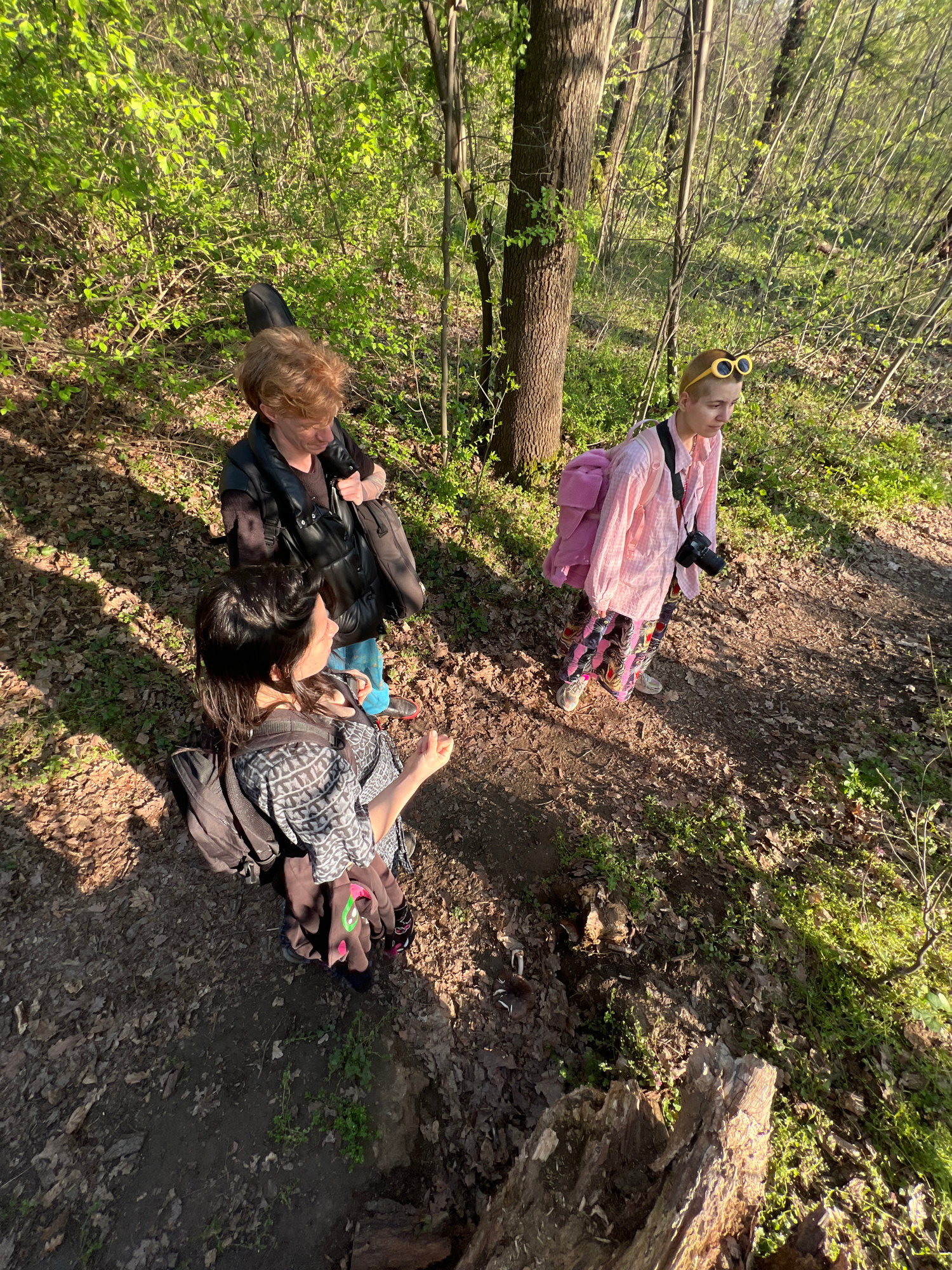The scene depicts a group of individuals in a wooded area. One person, dressed in a pink outfit with a camera, stands near a tree. Another group of three people are seated on the ground, with backpack…read more