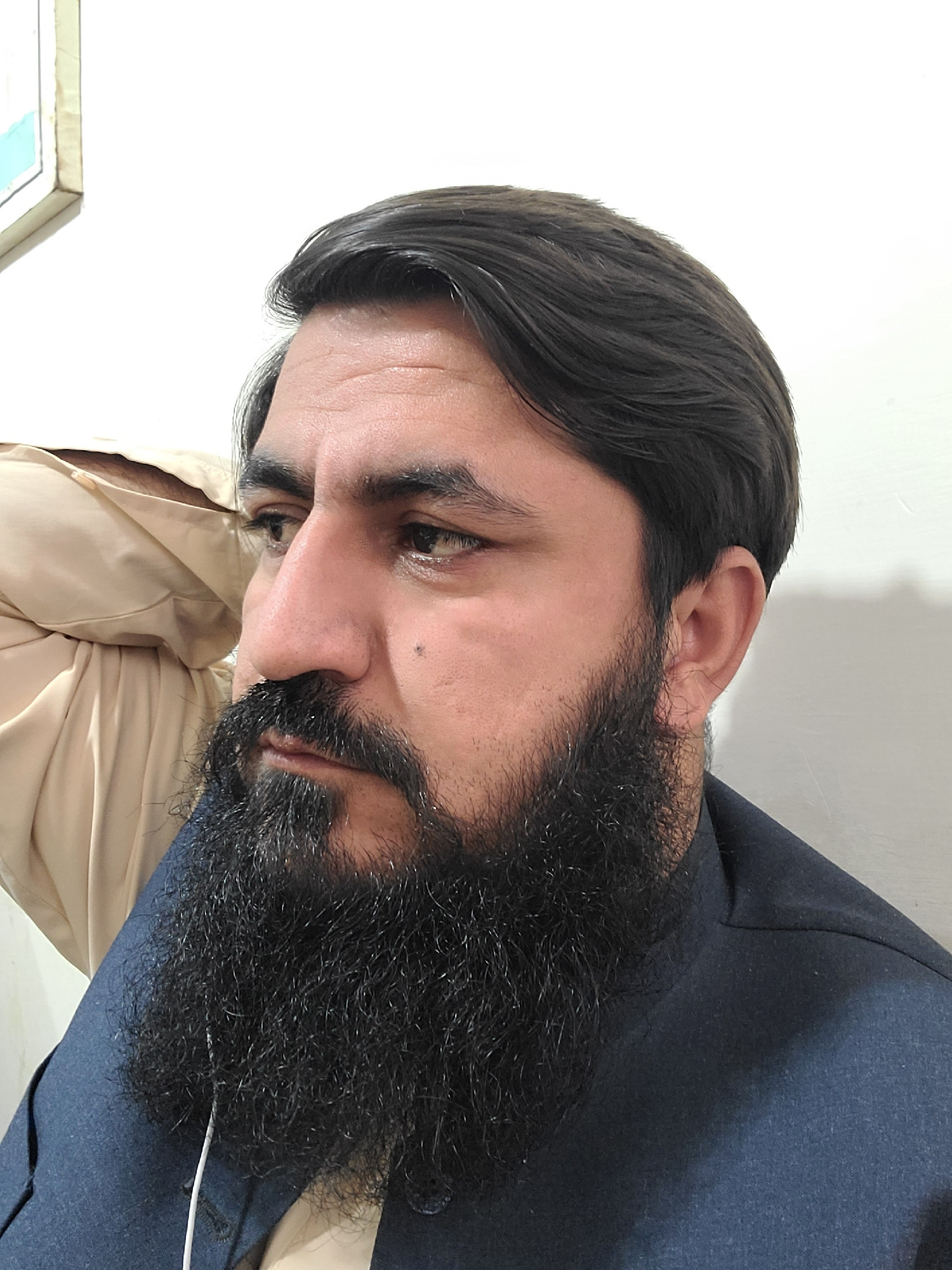 A headshot depicts a man with dark hair and a full black beard, possibly in Quetta City Tehsil, Pakistan. He has a slight frown. He is wearing a dark blue suit over a light tan shirt.