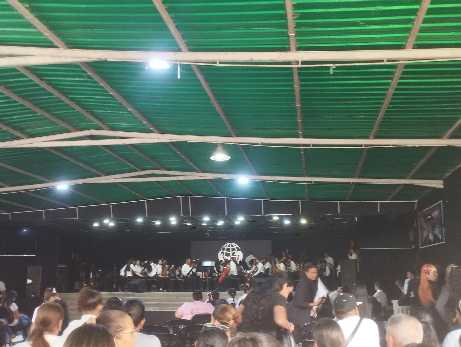 The image shows an indoor event in Tinaquillo, Venezuela. A crowd is seated in rows facing a stage where an orchestra is performing. The performers are wearing black and white attire. Behind the orche…read more