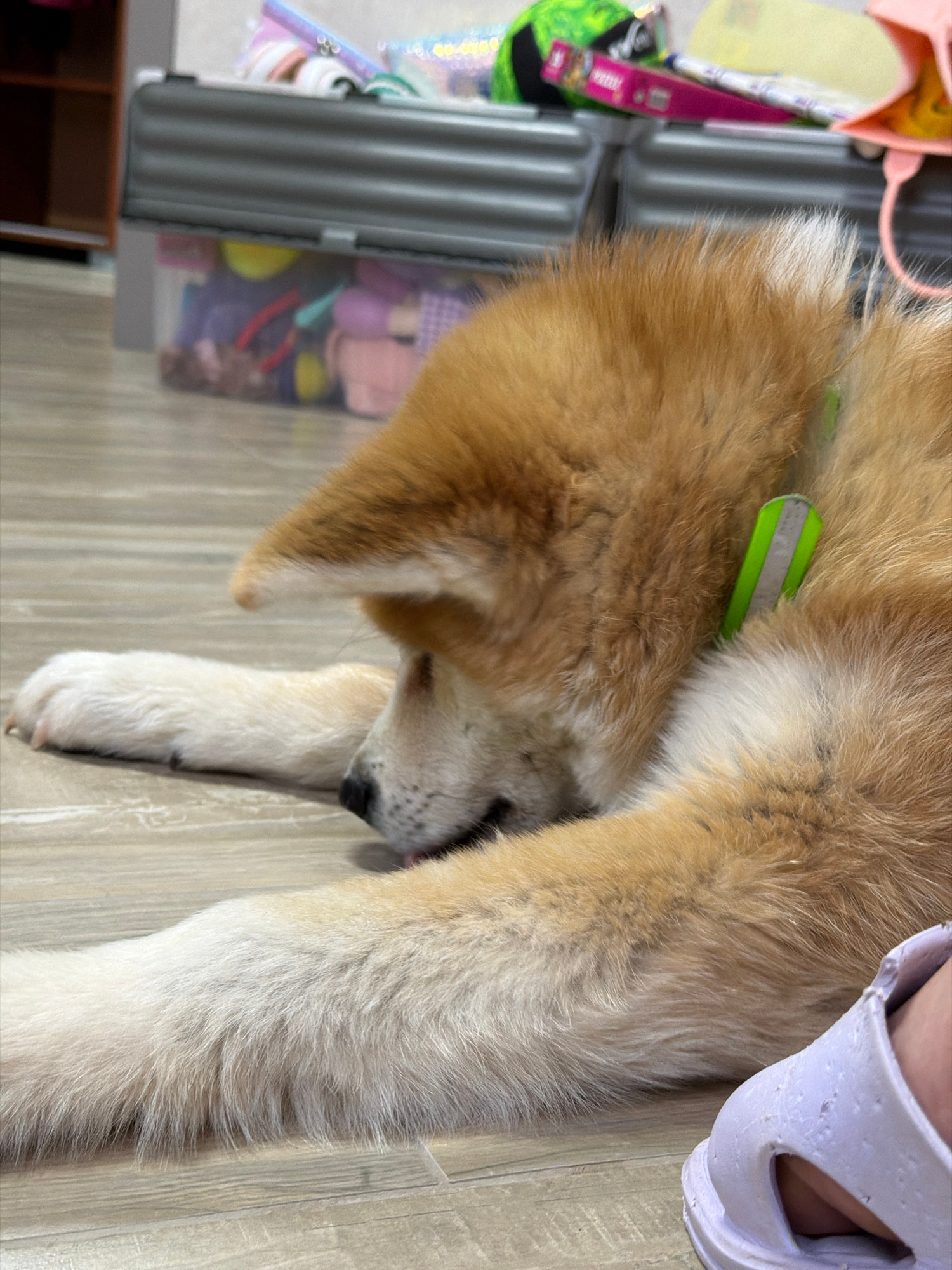 A medium shot depicts a furry, light brown and white dog lying on its back on a wooden floor. The dog has a green collar and its paws are raised in the air. A white sandal rests on the floor near the…read more