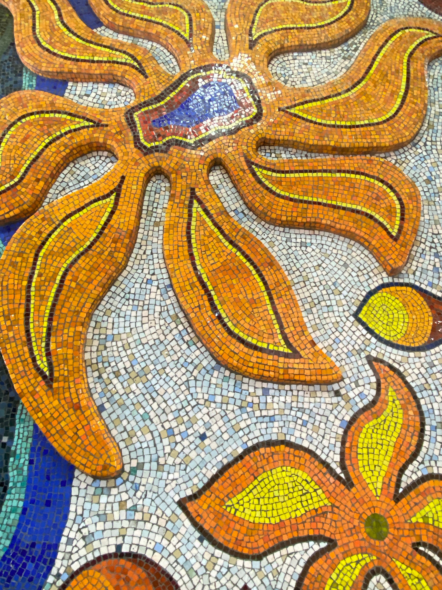 The image shows a close-up of a mosaic in Sochi, Russia. The mosaic features two stylized floral designs. The larger one, on the left, has long, curving orange petals with a yellow stripe running alon…read more