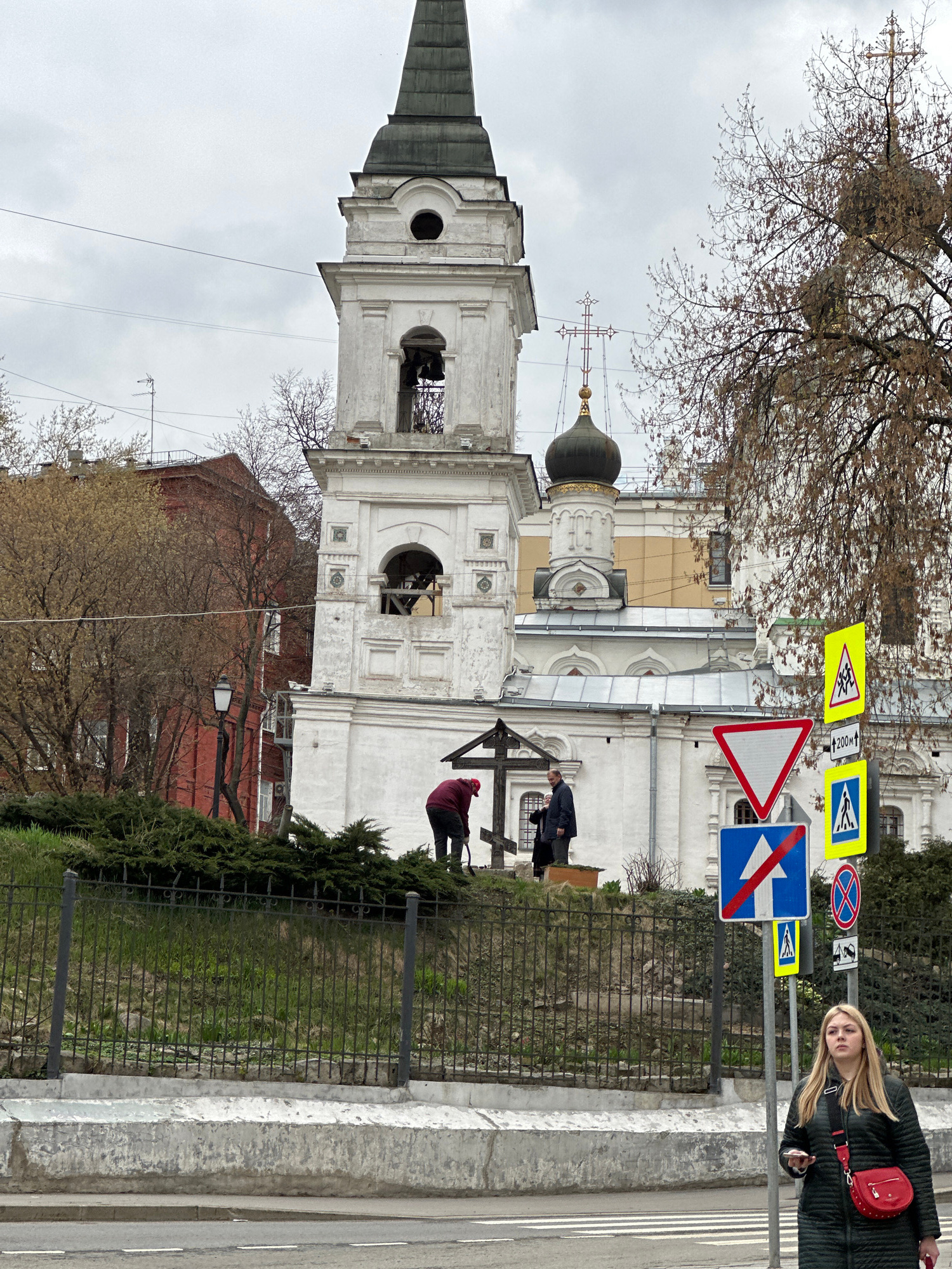 The image captures a street scene in Moscow, Russia, featuring an Orthodox church prominently in the background. The church is white with a black dome and gold accents. A bell tower is attached to the…read more