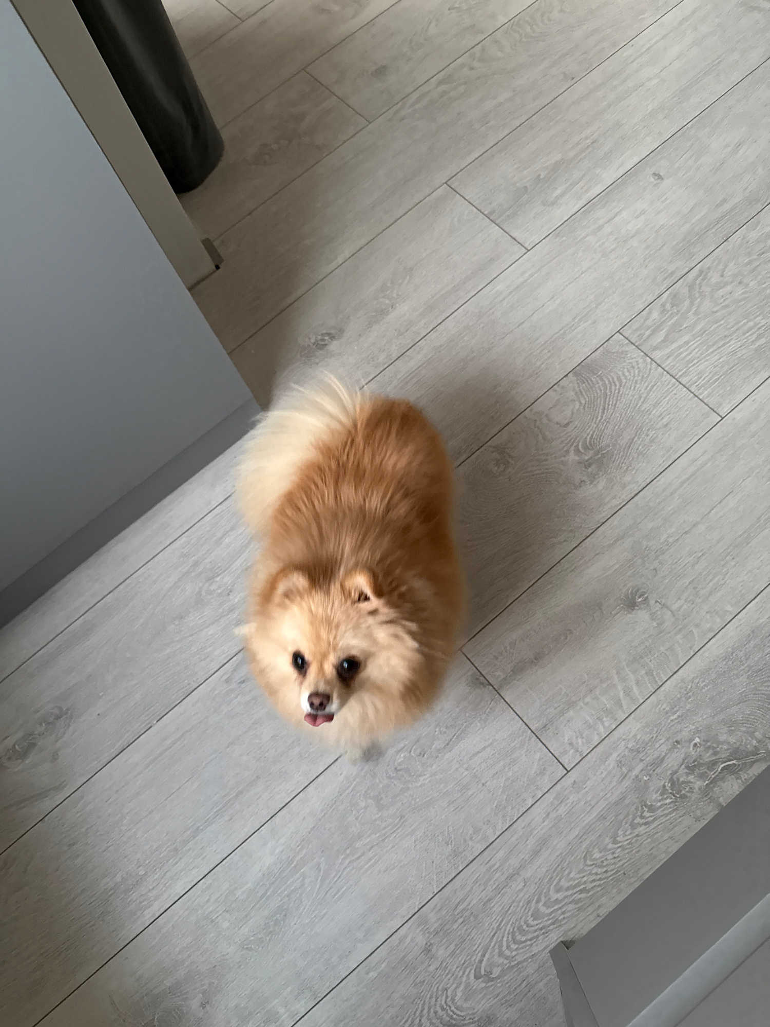 The image shows a Pomeranian dog standing on a light grey wood-look floor. A grey cabinet or countertop is visible at the bottom left and top right of the frame. The dog is looking up and has its tong…read more