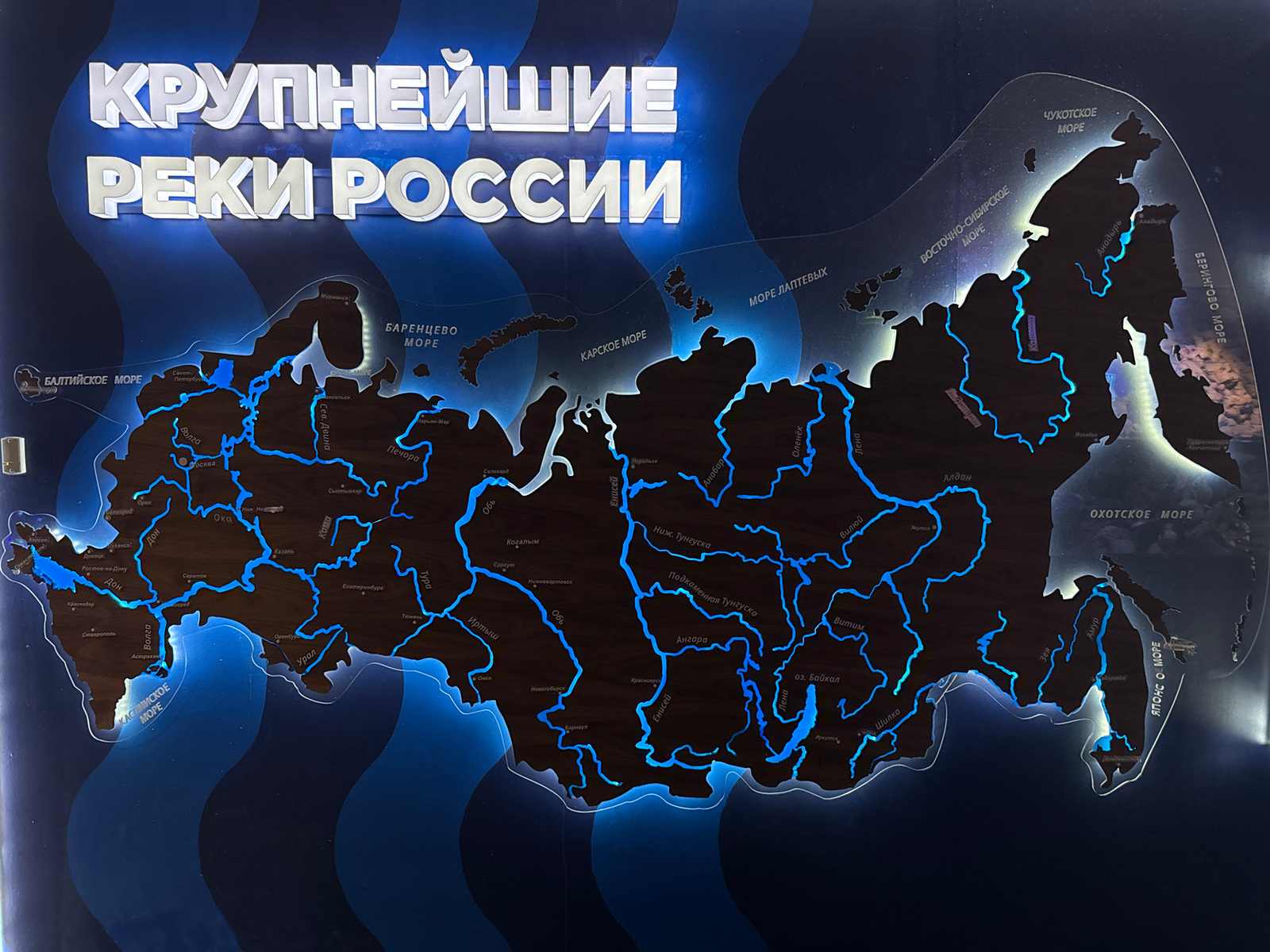 The image shows an illuminated map of Russia highlighting the major rivers. The map features the country's geographical outline with blue lines indicating the rivers, and city names are labeled in whi…read more