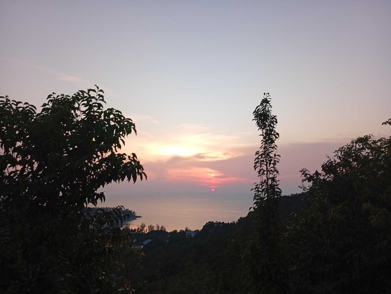 This landscape photograph depicts a breathtaking sunset over a body of water, likely the Andaman Sea, viewed from an elevated vantage point in Baan Wang Ta Kien, Thailand. The scene is dominated by a…read more