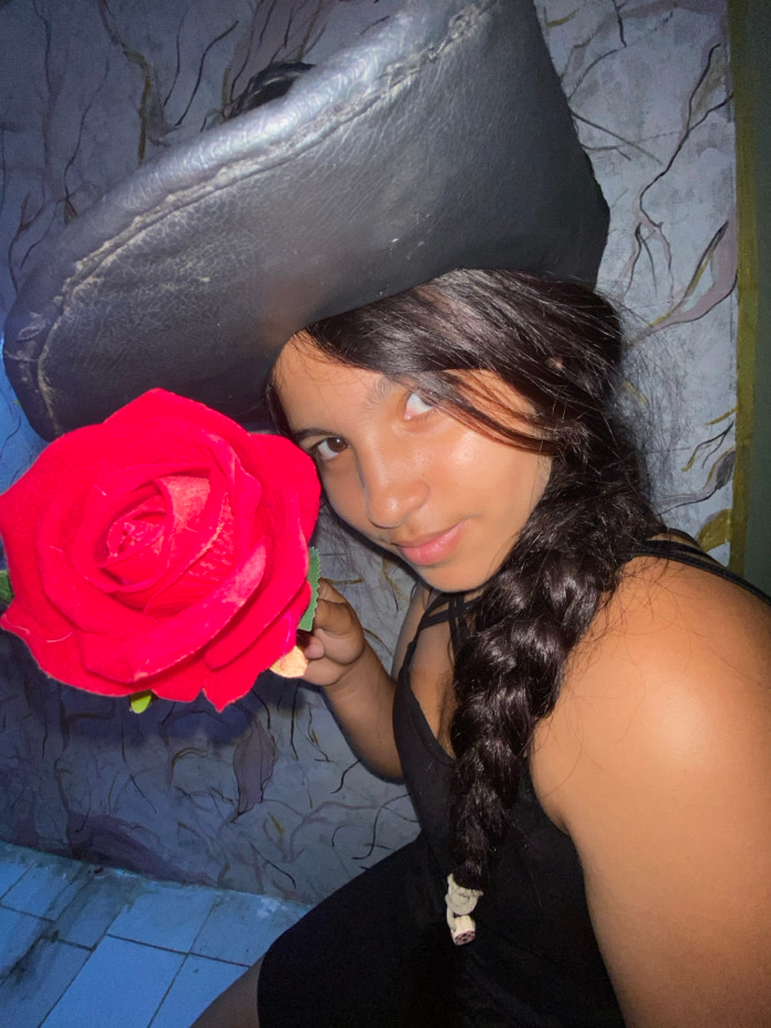 A woman lies on a patterned surface, resting her head on a black cushion. She holds a large red rose with green stem in her hand, positioned near her face. She has dark hair, styled with loose braids,…read more
