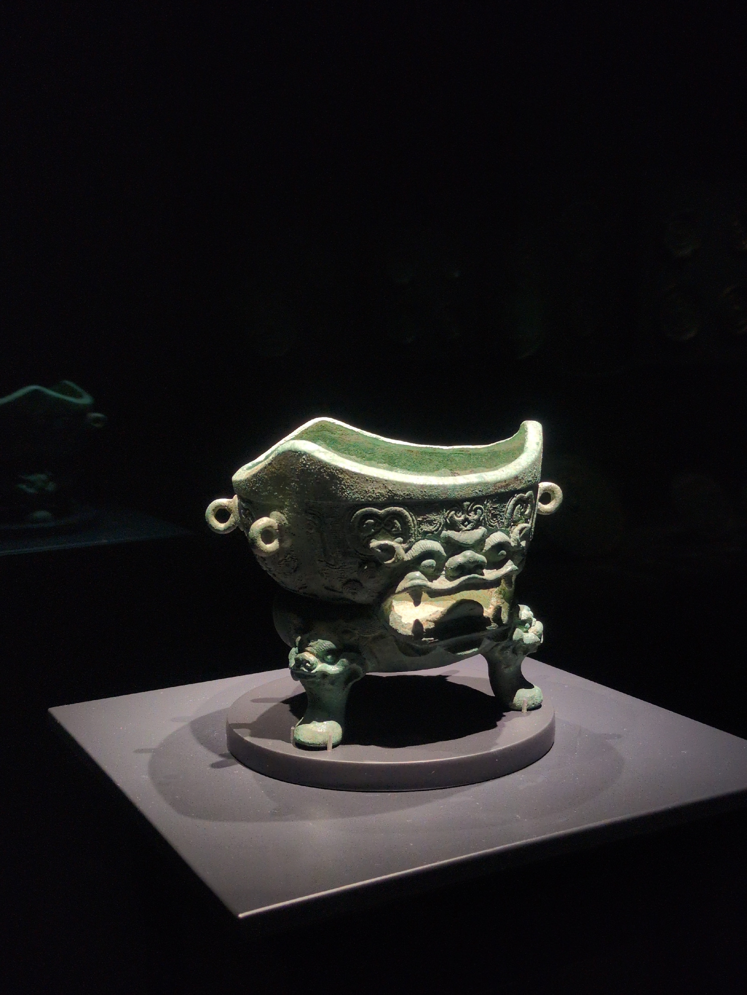 A bronze artifact is mounted on a dark grey, diamond-shaped plaque with a circular hole. The artifact has a curved, cup-like structure with ring attachments and is decorated with lion or dragon head f…read more