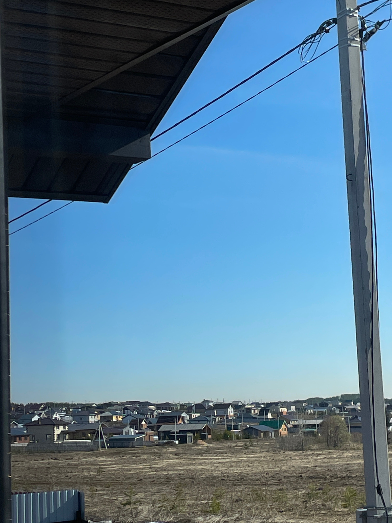 The image shows a view from an elevated position in what appears to be a suburban or rural area. The sky is clear blue, occupying the majority of the frame. A section of a dark-colored building is vis…read more