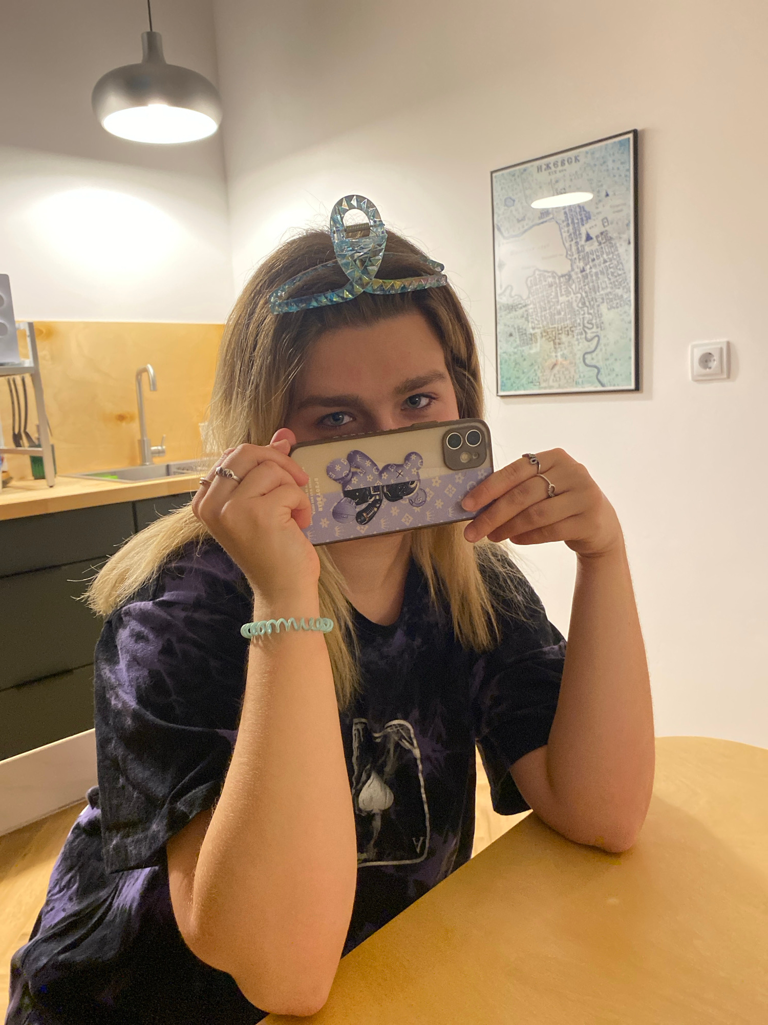 A young woman is taking a selfie indoors. She holds a phone with a decorative case featuring a cartoon bear in front of her face, obscuring most of it except for one visible eye. She has blonde hair with a jeweled blue hair clip. She is wearing a dark-colored t-shirt and a blue spiral bracelet. Two silver rings are visible on her fingers. Behind her, a framed map hangs on the wall, along with an electrical outlet. The map features the plan of a city, specifically the city of Izhevsk, Russia. A modern-style pendant light illuminates part of the scene. A kitchen counter and sink are visible in the background, suggesting the location is possibly an apartment or house. A yellow surface, possibly a table or counter, is also visible. | Open Wire