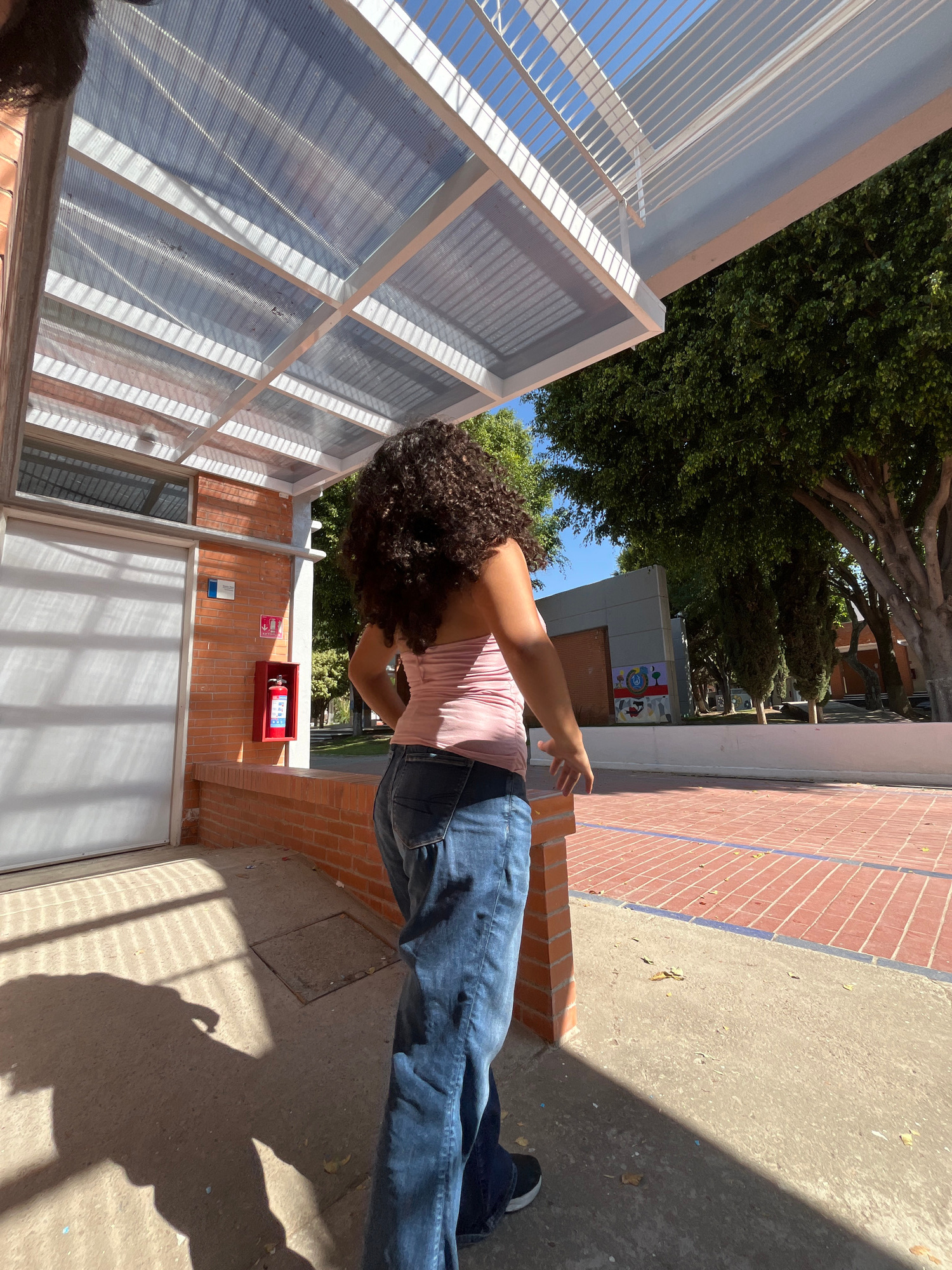 An outdoor scene in Puebla, Mexico, features a person observed from behind, standing under a translucent corrugated plastic canopy supported by a white metal frame. The individual has dark, curly hair…read more