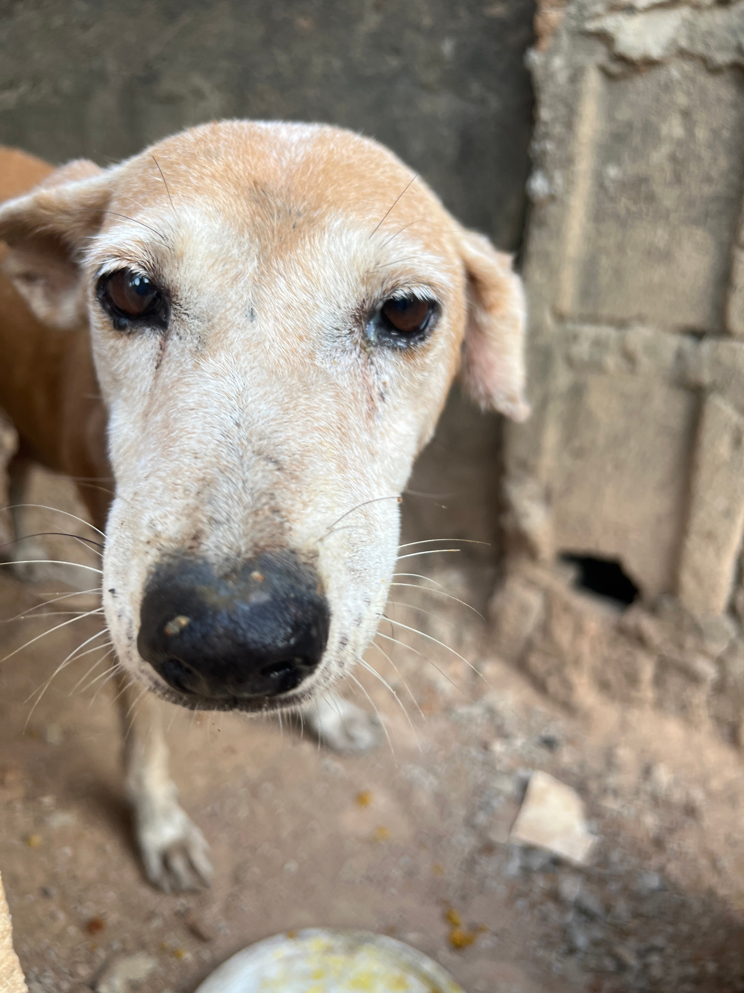 The image is a close-up, high-angle shot of a dog. The dog has light tan and white fur and a large, black nose. Its eyes are brown and its ears are floppy. The background appears to be a dirt or concrβ¦read more
