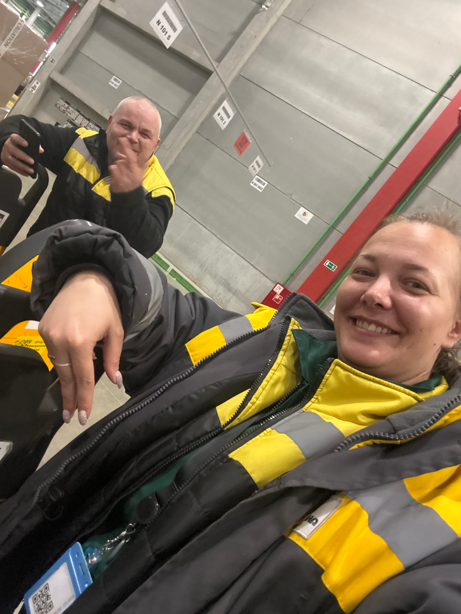 Two individuals are visible in this selfie, possibly taken inside a large warehouse or industrial facility. The individual in the foreground, likely the one taking the photo, is a fair-skinned woman w…read more