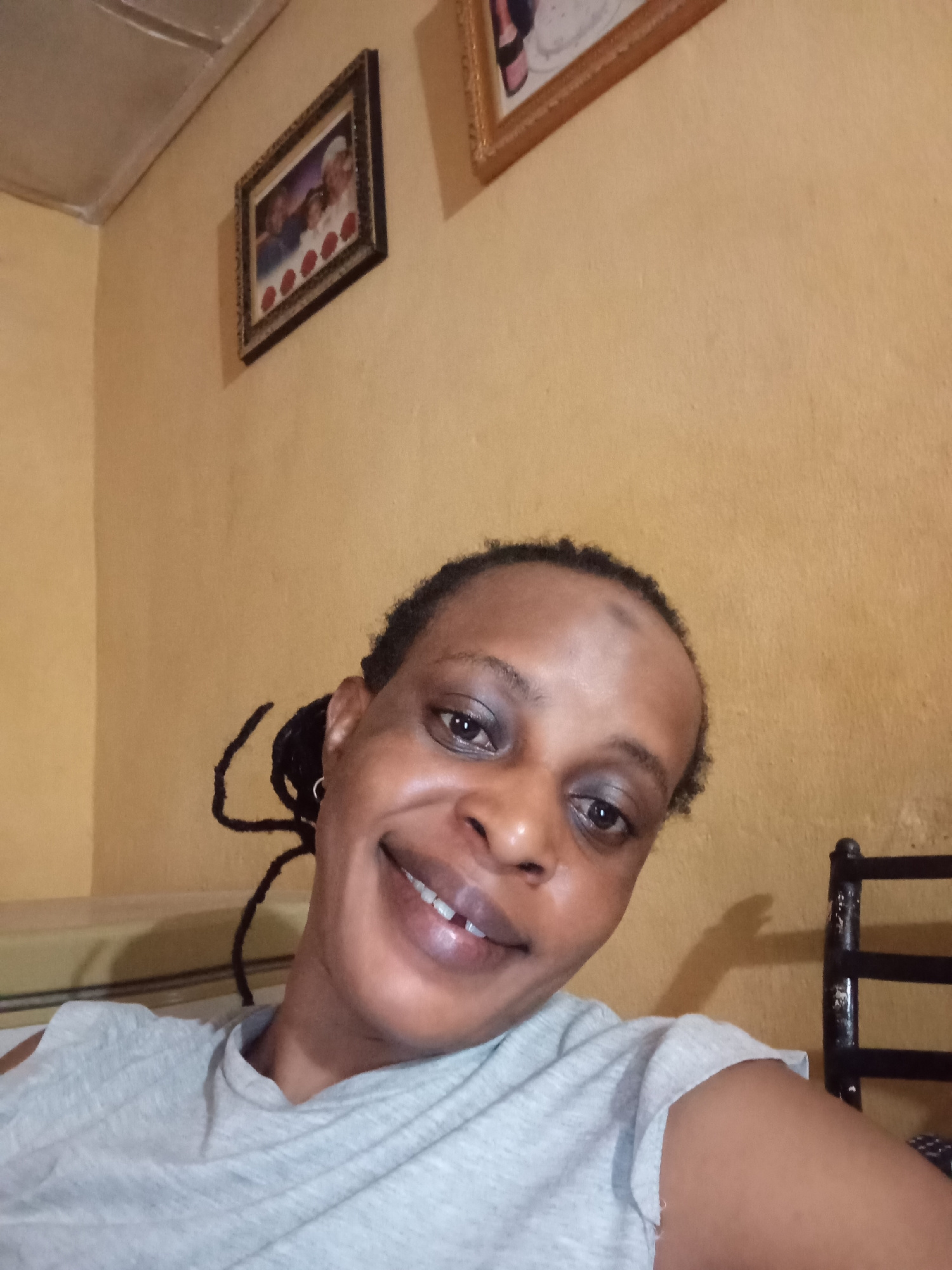 A person with dark skin and hair pulled back into twists, wearing a light gray T-shirt, is smiling in a selfie. The background shows an interior room with mustard-yellow walls. Two framed pictures han…read more