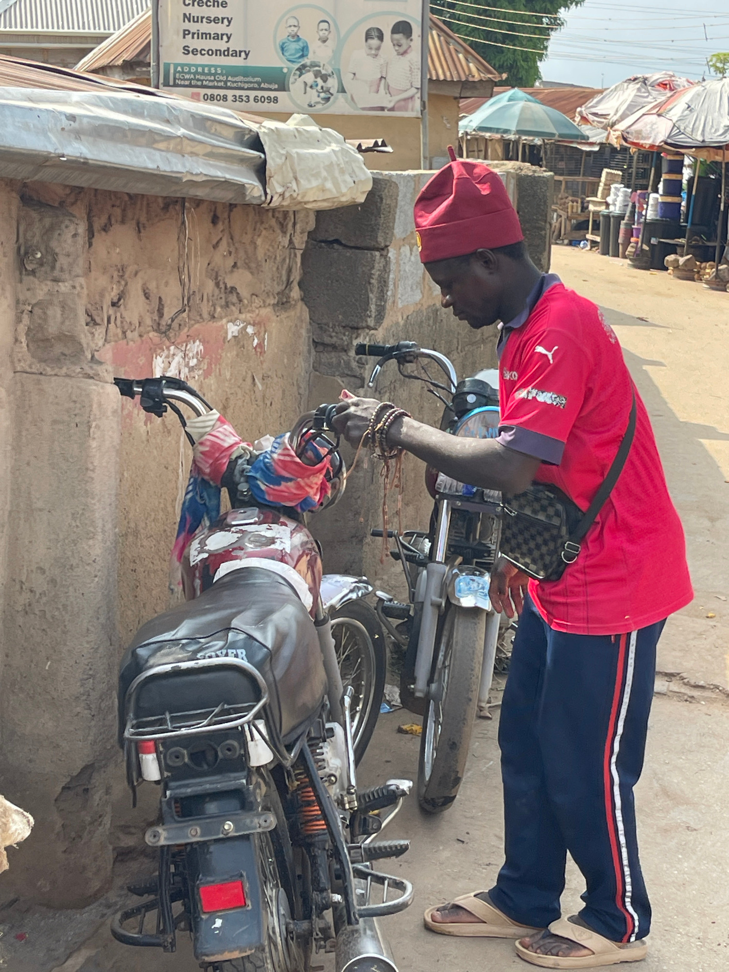An outdoor scene in Kuchigoro, Nigeria, depicts a man leaning over a motorcycle on what appears to be a street or market area under bright daylight. The man is wearing a red long-sleeved shirt with a…read more