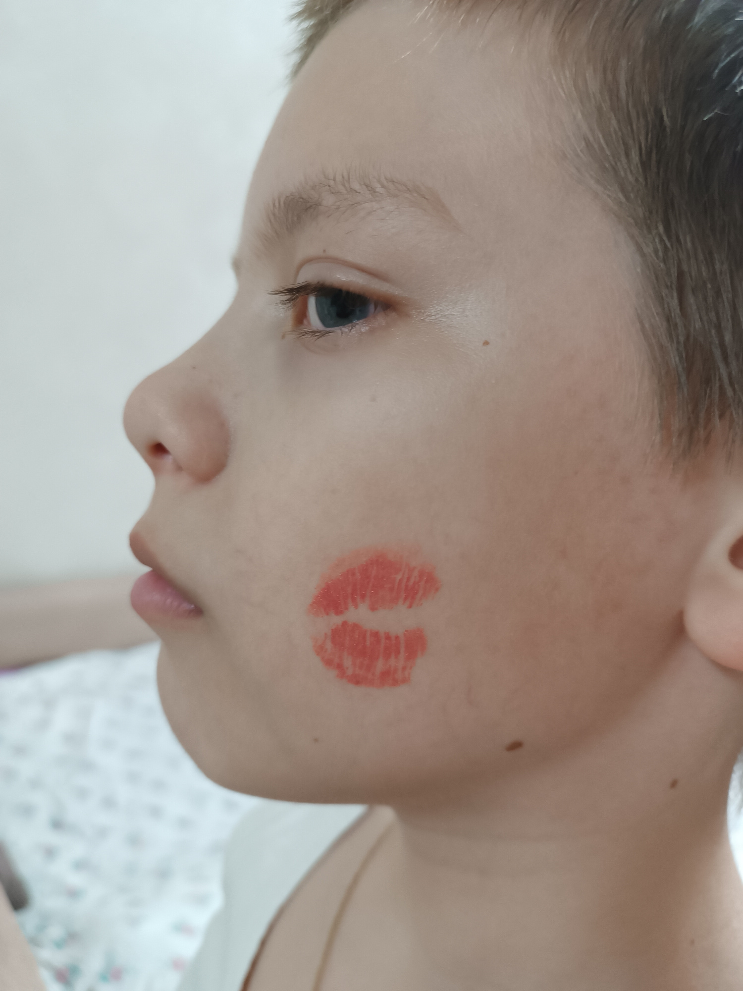 A close-up, profile shot captures a young boy with light skin and short, blond hair. The boy's blue eye is partially visible, looking straight ahead. A distinct red lipstick kiss mark is imprinted onβ¦read more