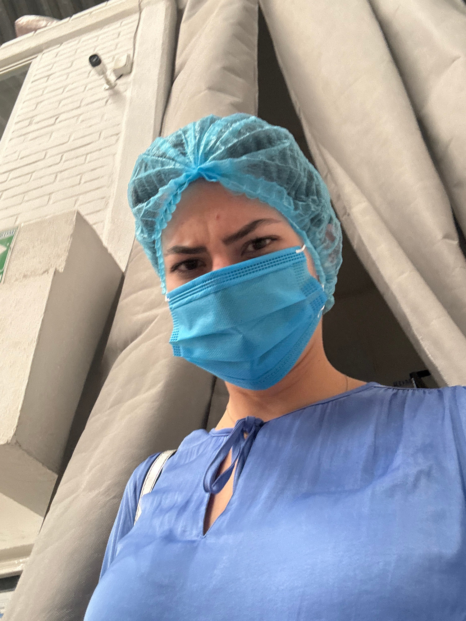 A person wearing a light blue surgical cap and a light blue surgical mask is depicted, facing slightly to the left of the frame. The person also has on a light blue surgical gown. The background consi…read more