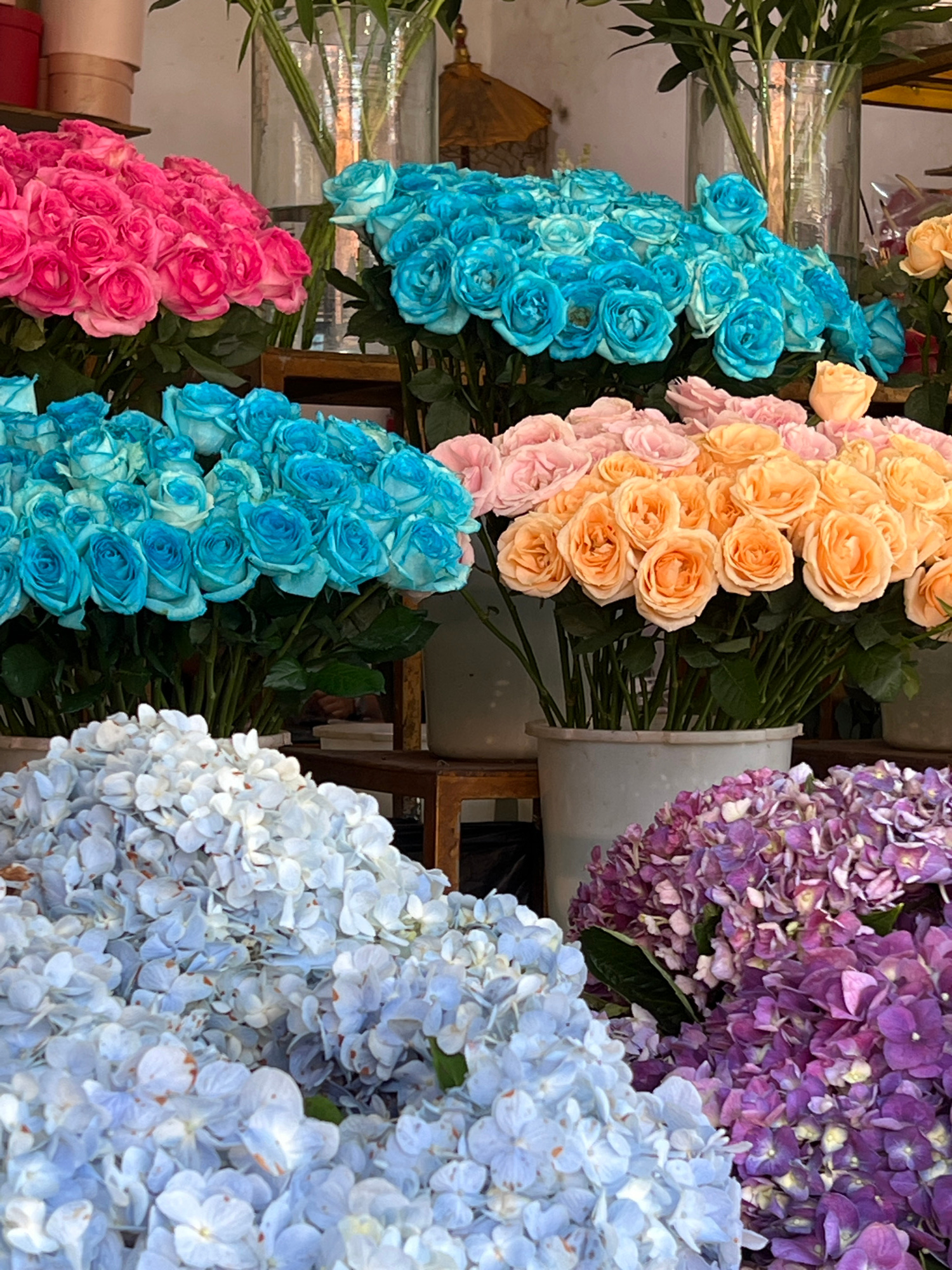 The image shows a display of flowers at a flower shop in Peliatan, Indonesia. Visible are several bunches of roses in various colors including pink, blue, and peach. There are also bunches of purple a…read more