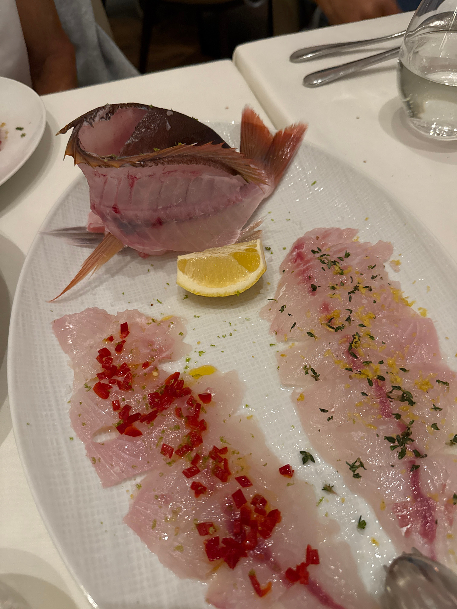 A white rectangular plate displays a deconstructed raw fish dish within a dining establishment in Athens, Greece. The upper left of the plate presents the carcass of a filleted fish, showing exposed r…read more
