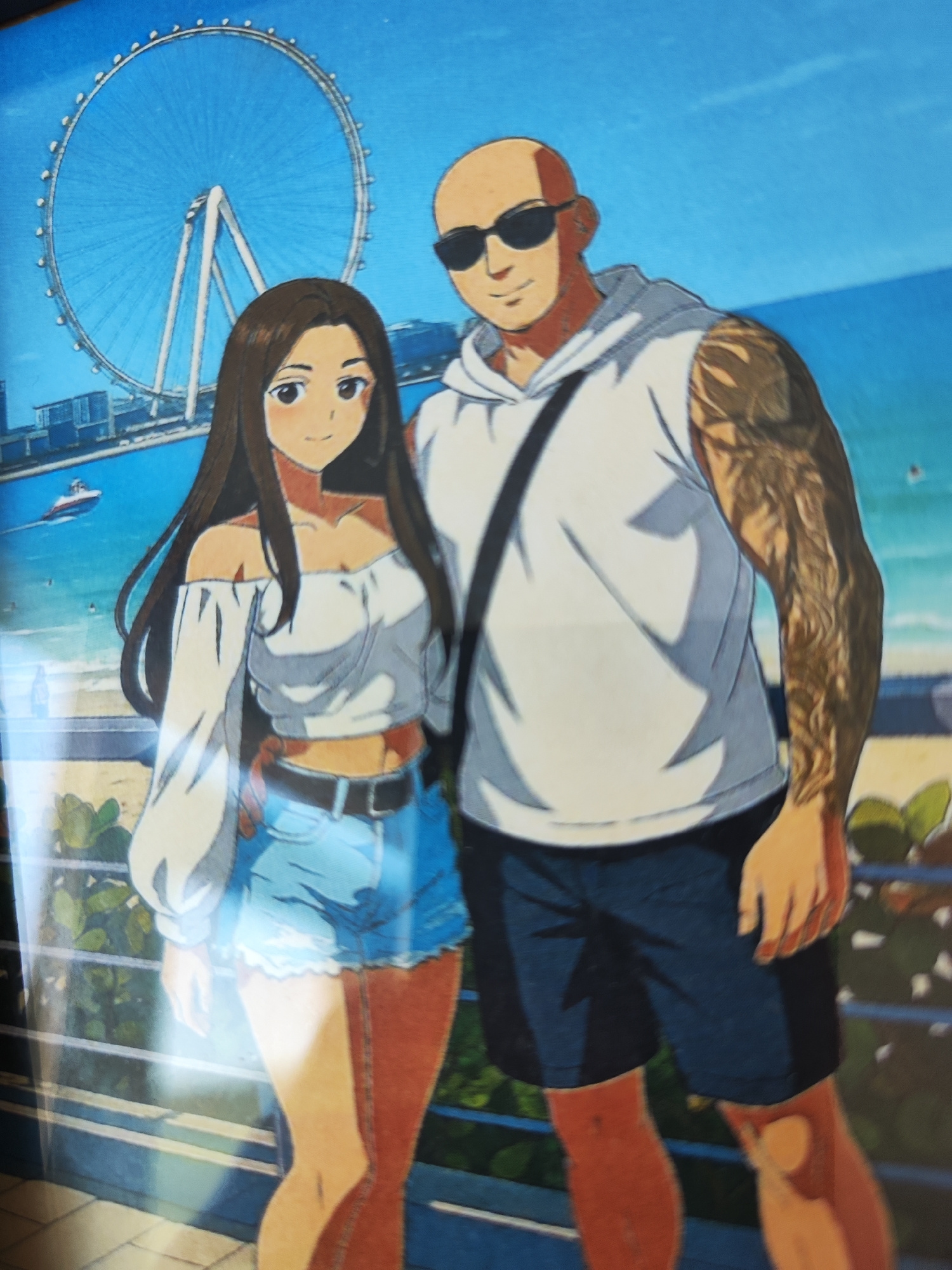 An anime-style illustration depicts a couple on a sunny day near a body of water with a large Ferris wheel in the background. The woman on the left has long, dark hair, wears an off-the-shoulder white…read more