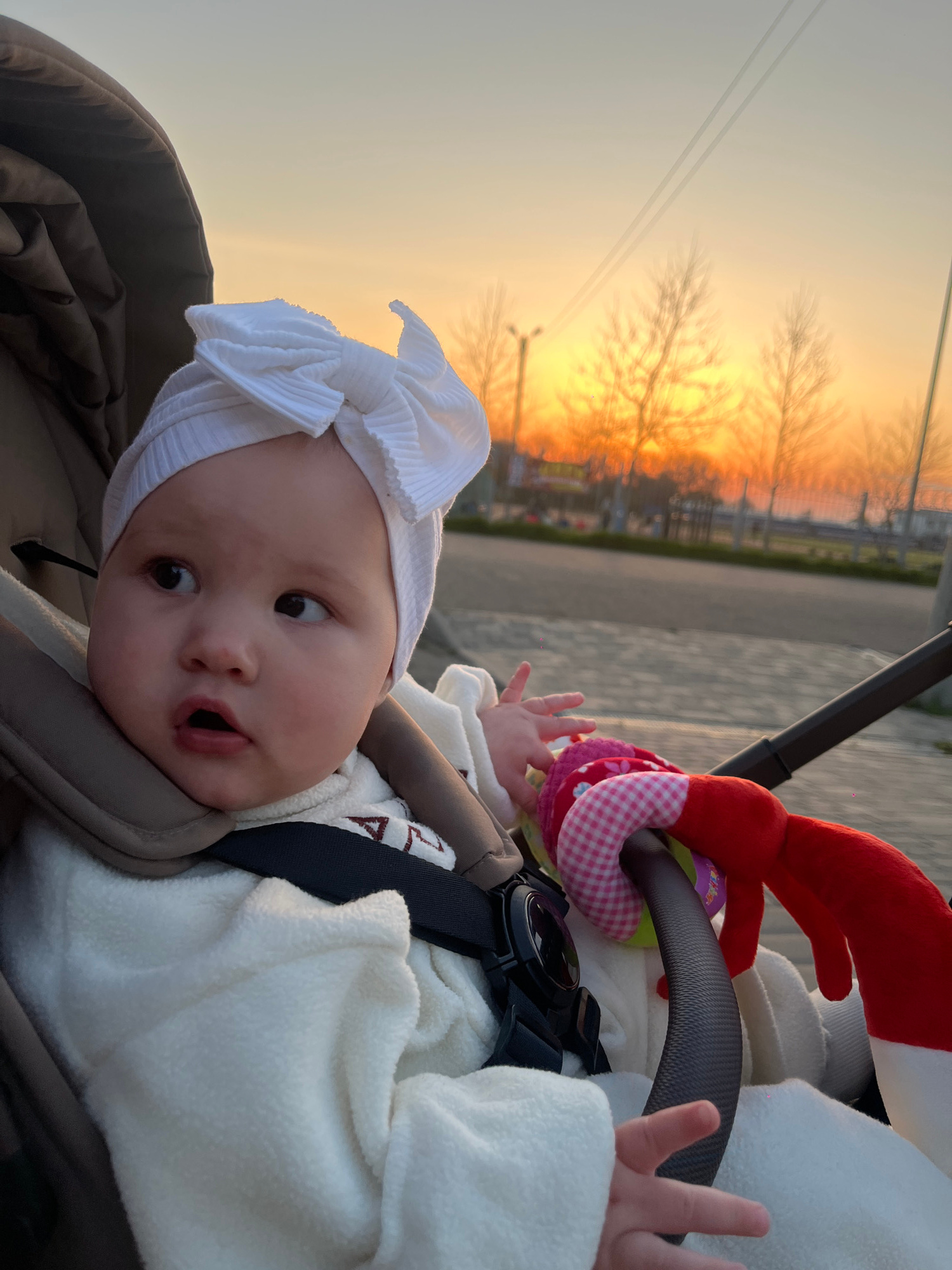 This image presents a close-up, tilted view of an infant in a stroller or carrier, set against a warm, glowing sky at either sunrise or sunset. The background reveals a clear sky painted in shades of…read more