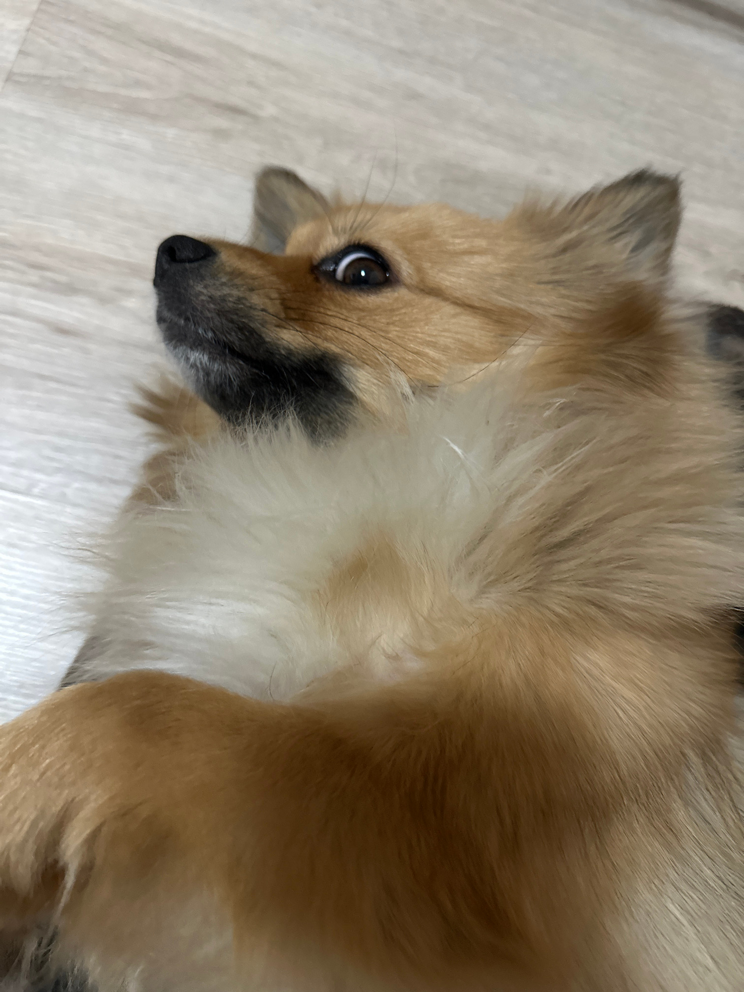 A close-up shot depicts a medium-sized dog with tan and light brown fur. The dog is lying on its side on a light-colored, wood-grain floor. Its head is turned towards the camera, revealing a dark nose…read more