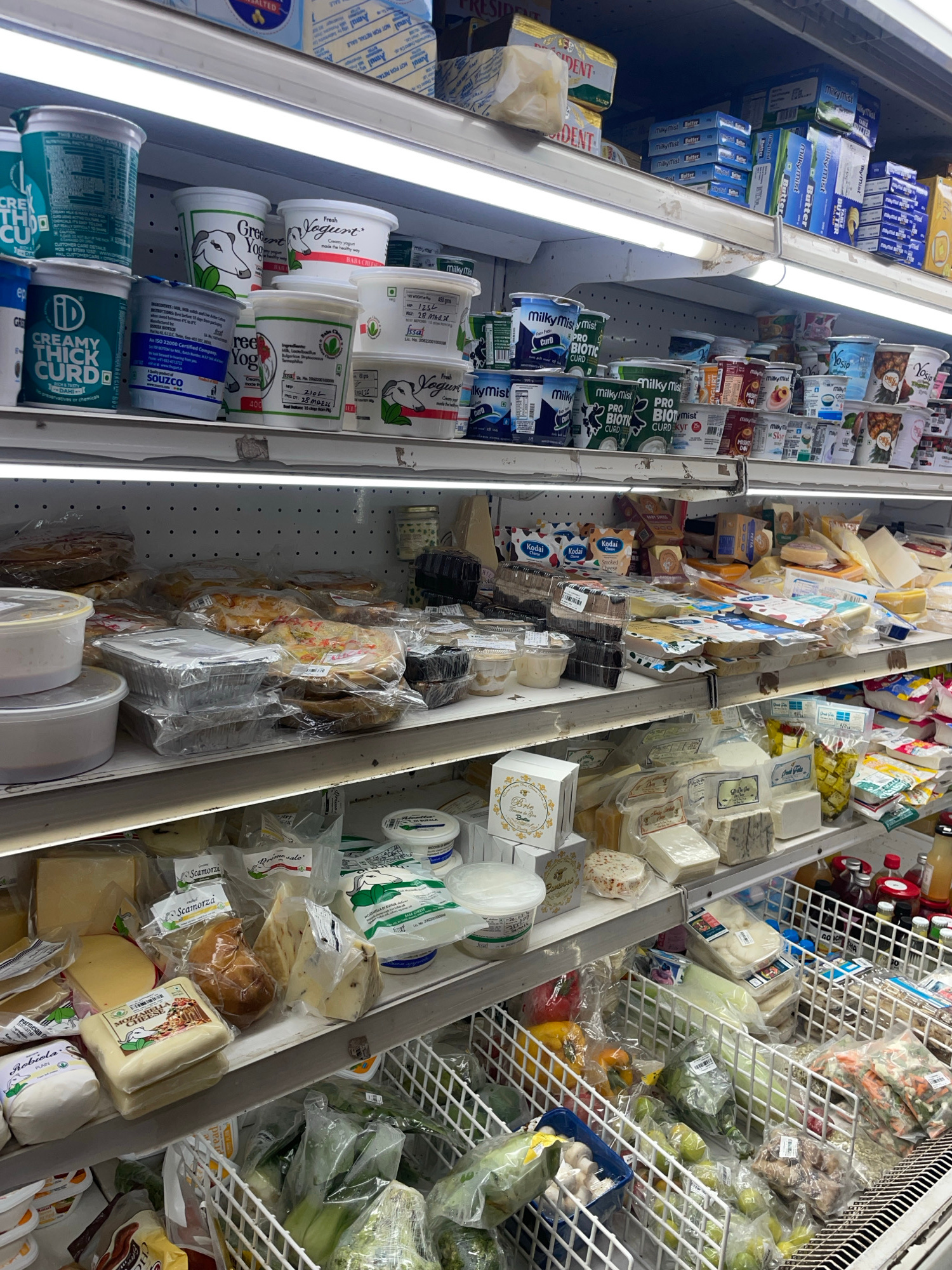 The image shows a refrigerated section in a store, likely in Oxel, India given the presence of brands such as Amul, Milky Mist, and Souzco. The shelves are stocked with a variety of dairy products inc…read more
