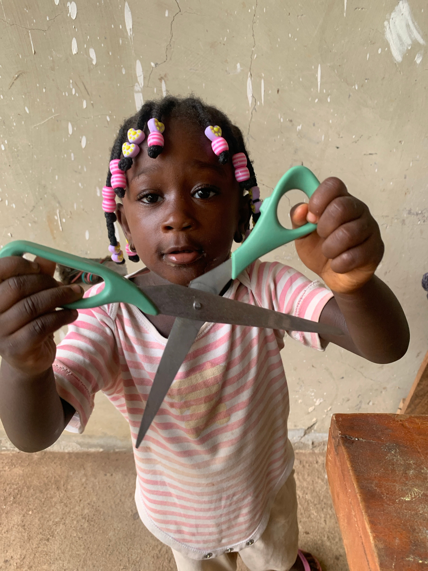 A child with dark skin and braided hair adorned with pink and purple beads is holding a pair of open scissors with green handles, directly facing the camera. The child is wearing a pink and white stri…read more